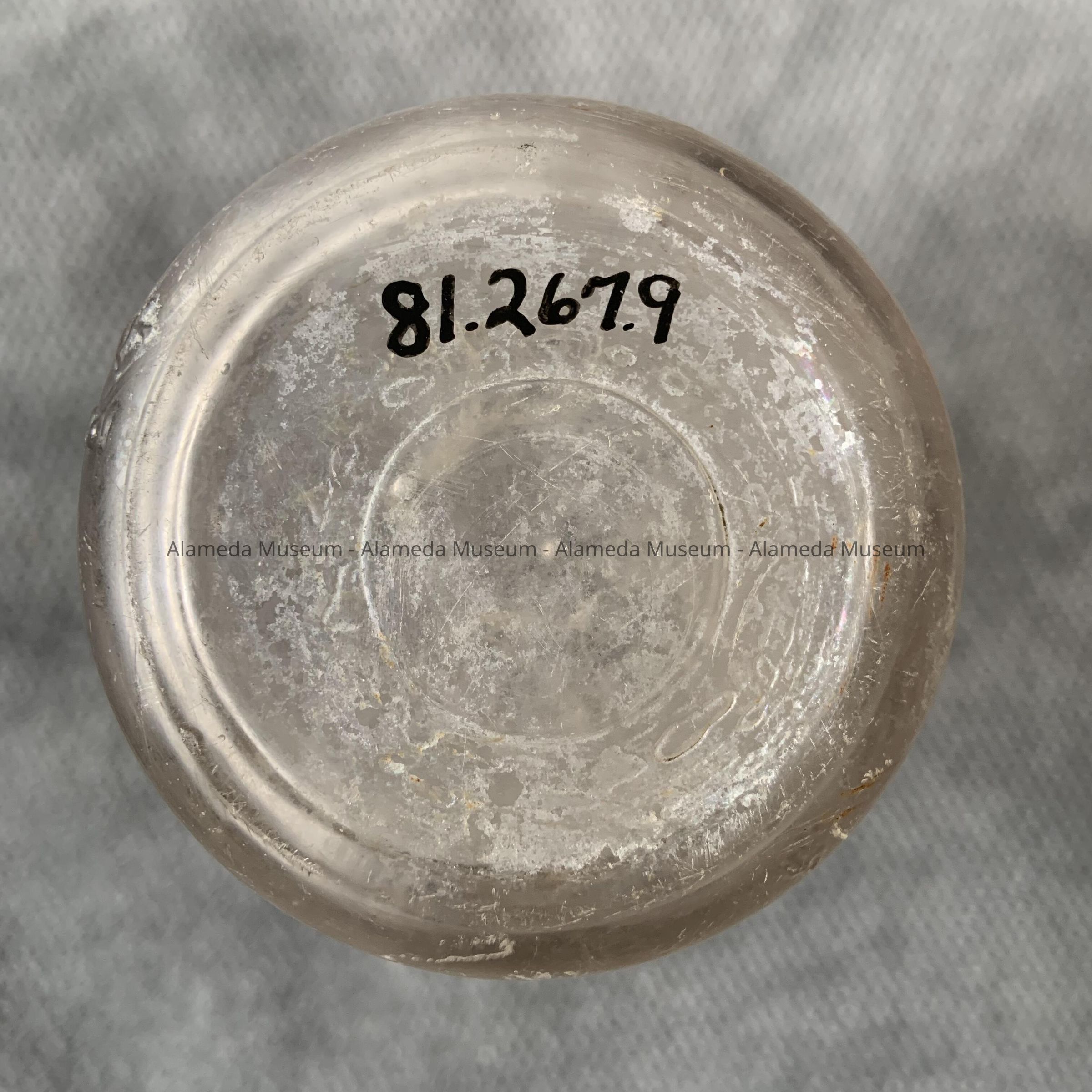The glass has a cloudy film from being exposed to salt water. Excavated by donors.