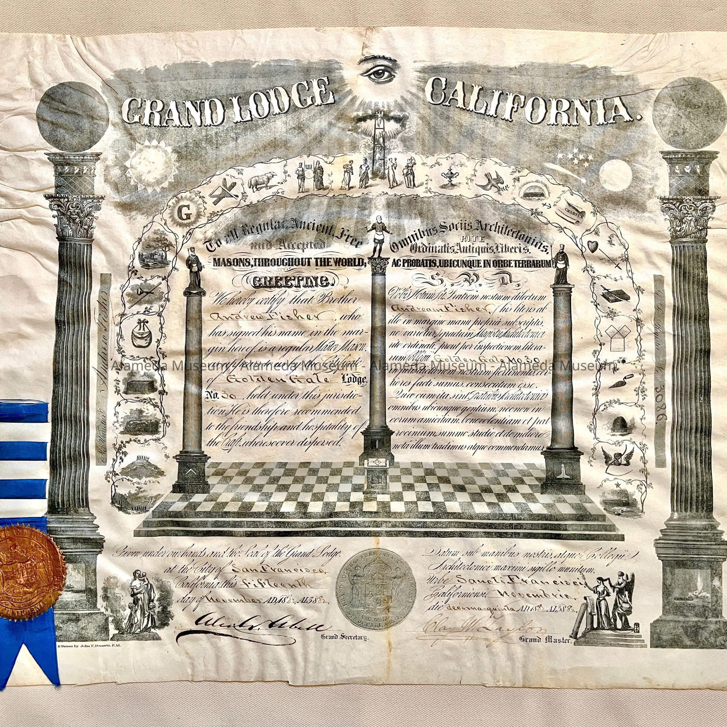 Membership certificate awarded Andrew Fisher, Golden Gate Lodge, Masonic Order, San Francisco. Dated Nov. 15, 1882.