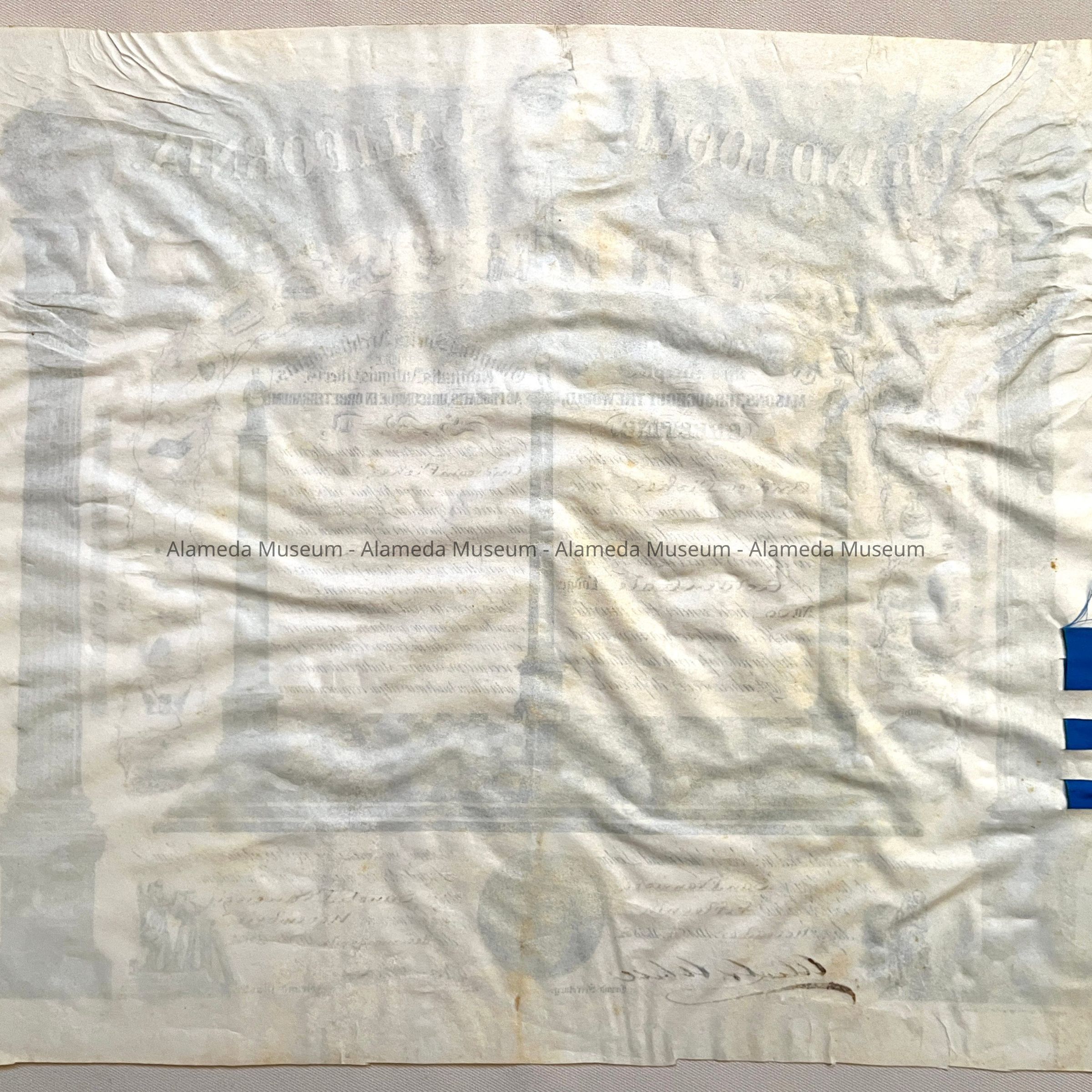 Description: Printed certificate on imitation parchment paper (black type) with bold heading "Grand Lodge California." Information inscribed in sepia colored ink.