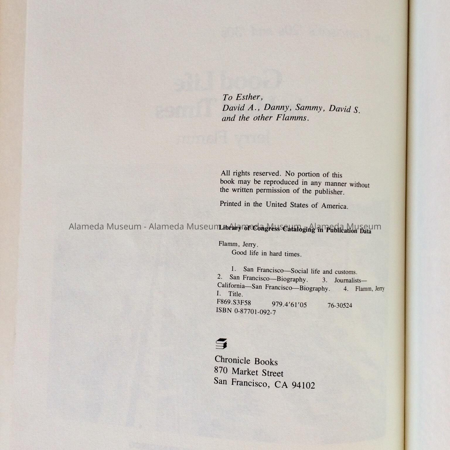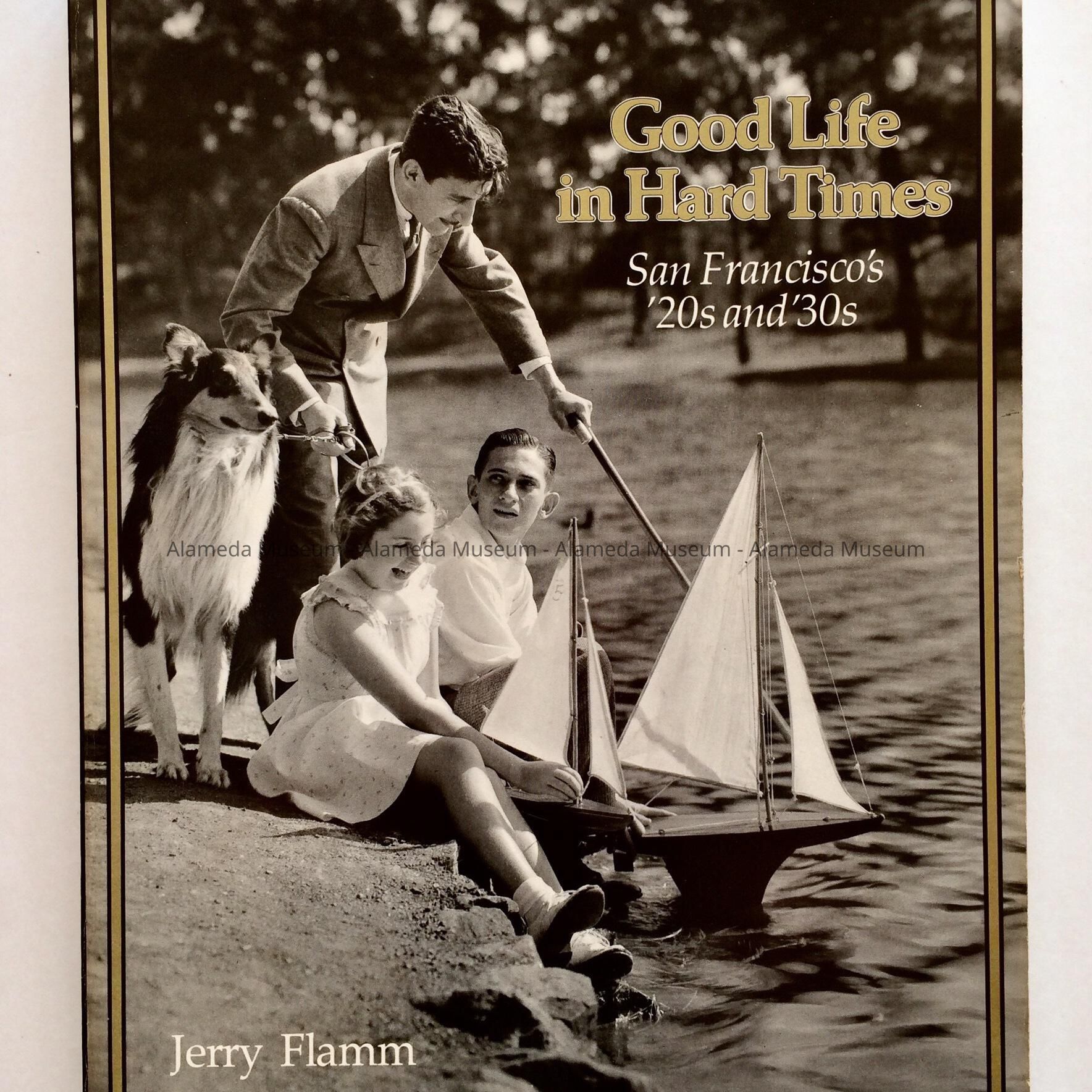Description: softbound book image of a man, dog, and two children with toy sailboats at a park, titled 'Good Life in Hard Times, San Francisco's '20s and '30s'. 171 pages. Author Jerry Flamm. Publisher, Chronicle Books, 1992. ISBN 0-87701-092-7.