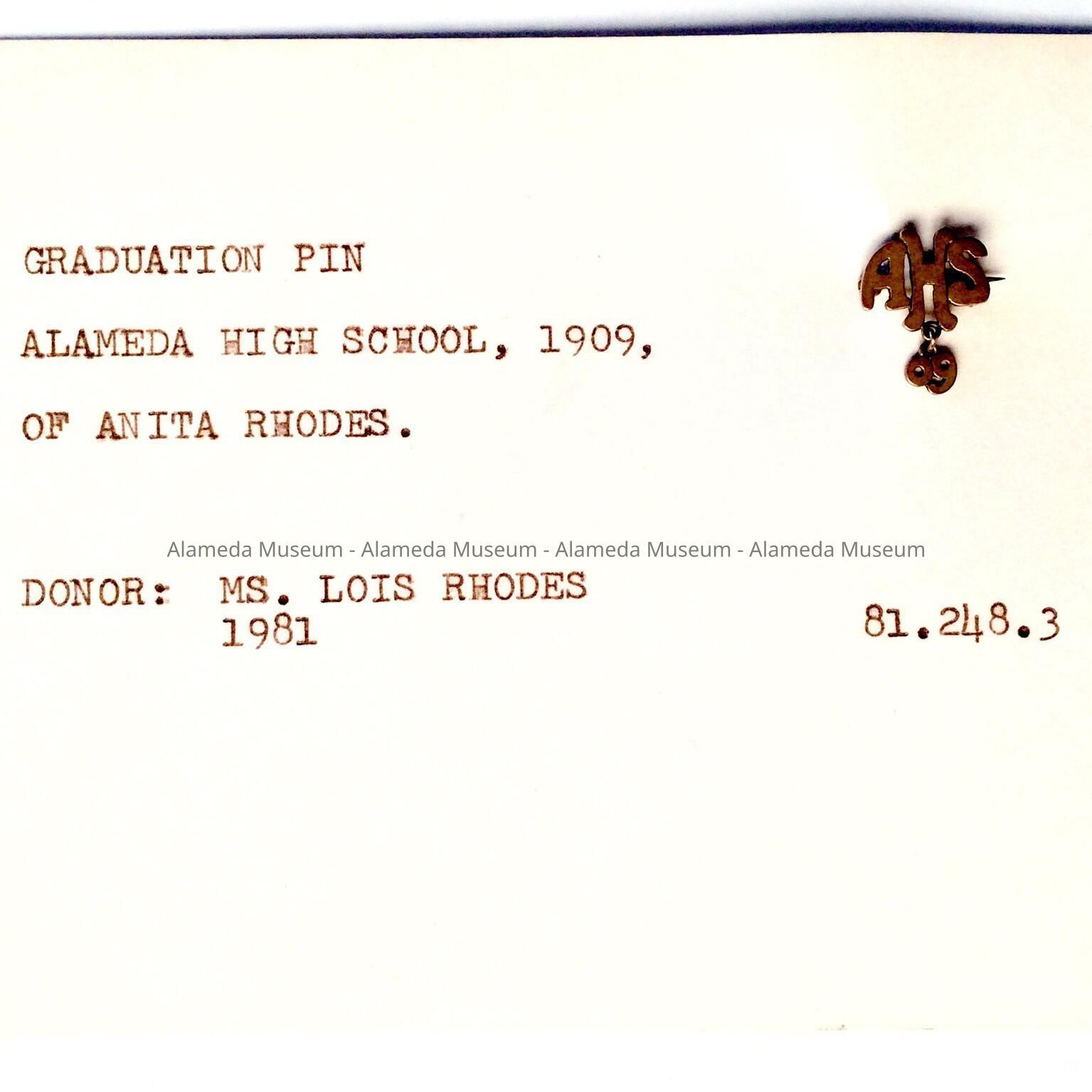 History of Object: Graduation pin, Alameda High School, 1909, of Anita Rhodes (married name Neper). The Rhodes family came to Alameda in 1892.