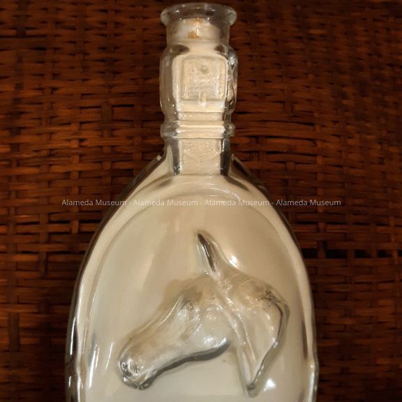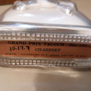 A CLEAR GLASS BOTTLE, WITH EMBOSSED DESIGN OF A HORSE’S HEAD SURROUNDED BY A SPUR. CLEAR GLASS BOTTLE HAS ITS ORIGINAL PAPER LABEL STATING, "GRAND PRIX TALCUM."
