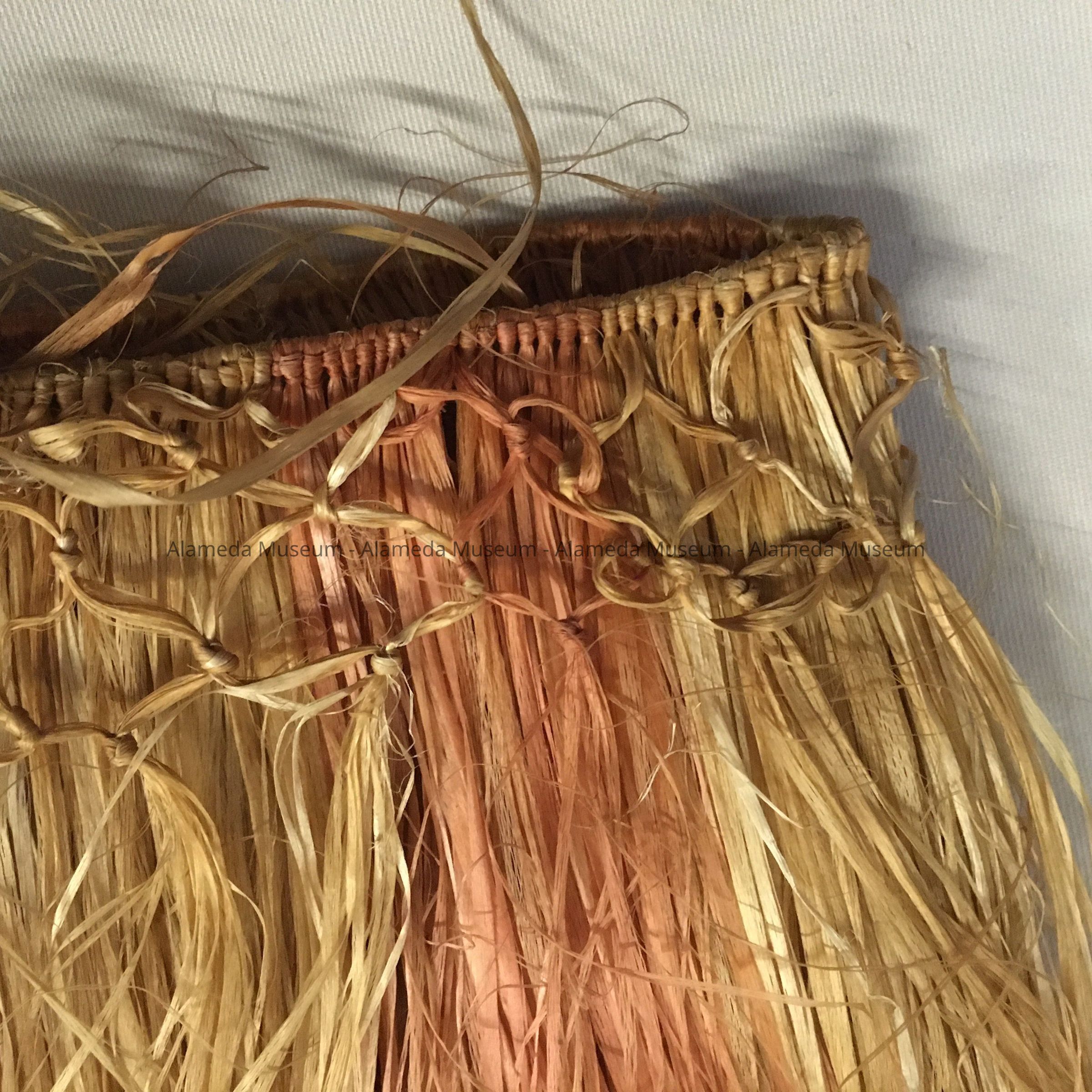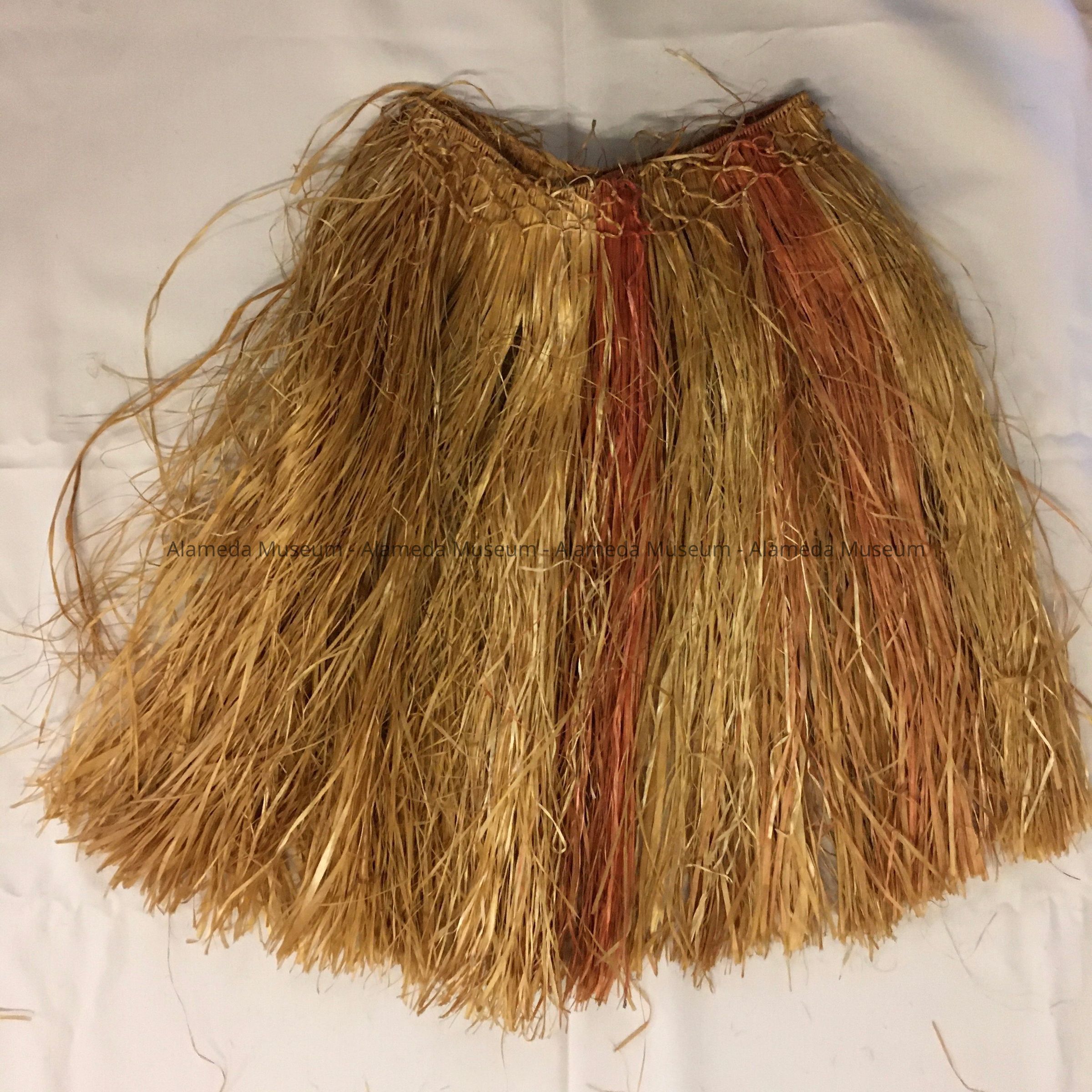 A GRASS SKIRT, RECEIVED AMONG SEVERAL OTHER GIFTS FROM STUDENTS IN SAMOA. ALAMEDA STUDENTS HAD SENT THEM GIFTS. THE SKIRT AND OTHER ITEMS WERE RECEIVED IN GRATITUDE FOR THE KINDNESS OF ALAMEDA STUDENTS. THIS IS AMONG SEVERAL ITEMS IN THE COLLECTION OF MS CAROLYN POTTER, TEACHER, WASHINGTON SCHOOL, ALAMEDA. (SEE CARD 09.26.1 FOR FURTHER DETAILS.)