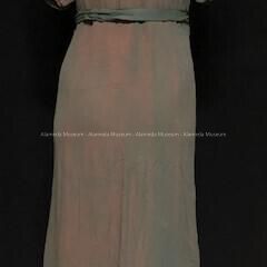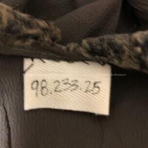ONE-PIECE DRESS OF DARK GREEN-COLORED CREPE. THE HEM AND COLLAR ARE TRIMMED IN IMITATION LAMB'S WOOL IN BLACK AND WHITE COLORS. DRESS HAS HALF SLEEVES WHICH ARE PARTIALLY GATHERED. THERE IS NO DRESSMAKER'S LABEL THEREON.