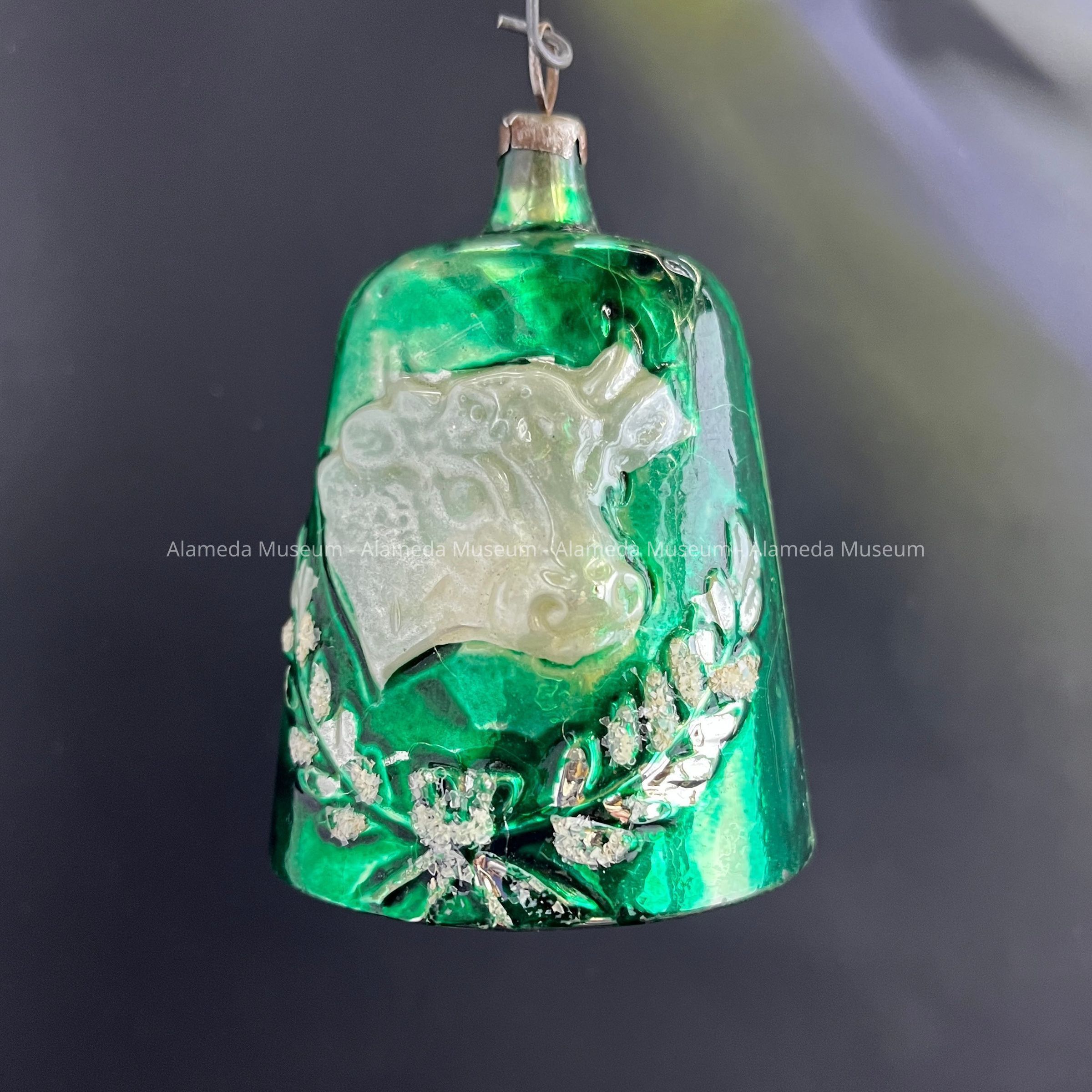 Description: Cast glass ornament in the shape of a cow's bell, of glass handpainted with green metallic paint, with on one side in relief the head of a cow with horns, in transparent white glass, and underneath in raised glass two floral bows tied underneath the cow's head with a bow, embellished with silver glitter. Inside is silver colored or mercury glass. The clapper is formed by a transparent blue glass bead attached with metal wire.