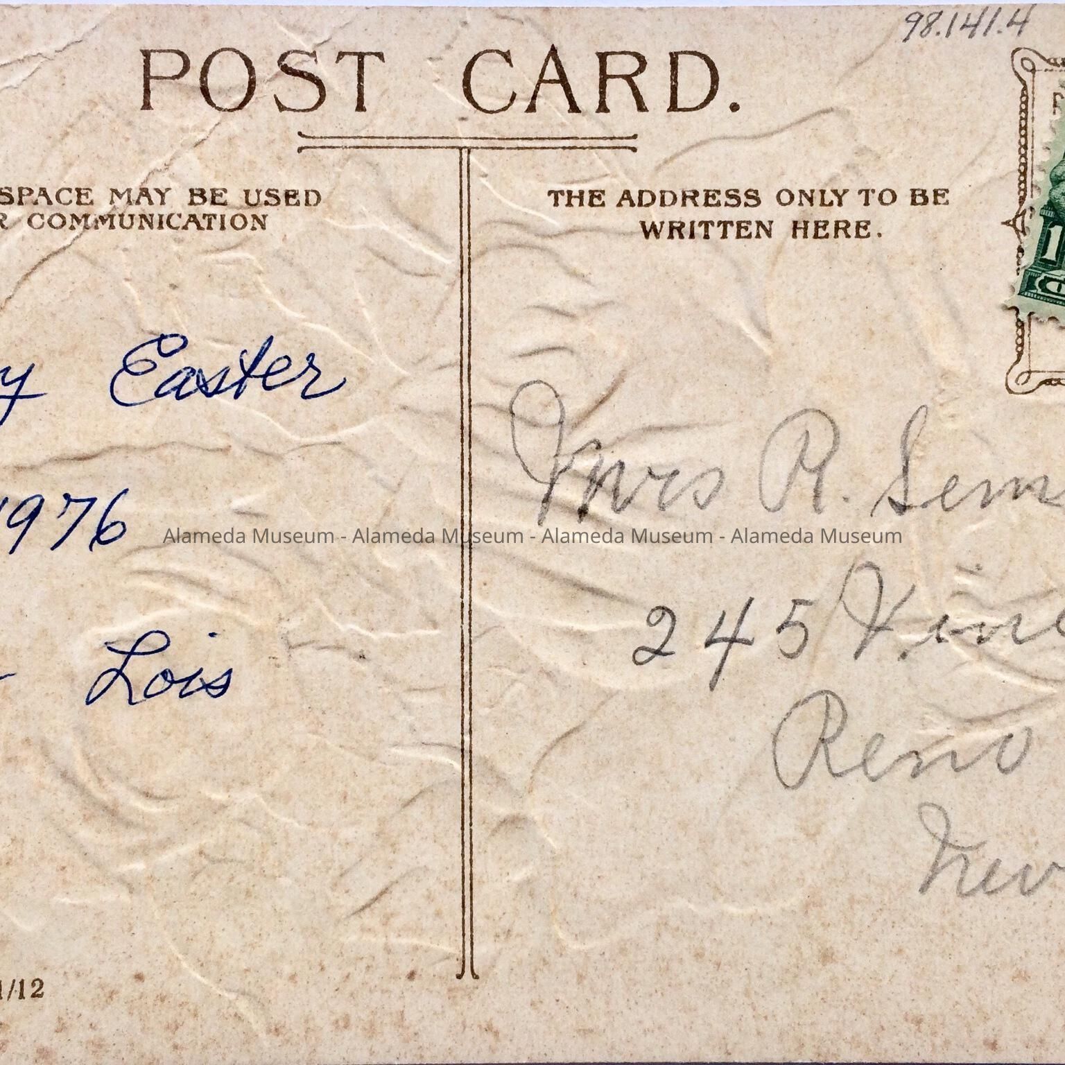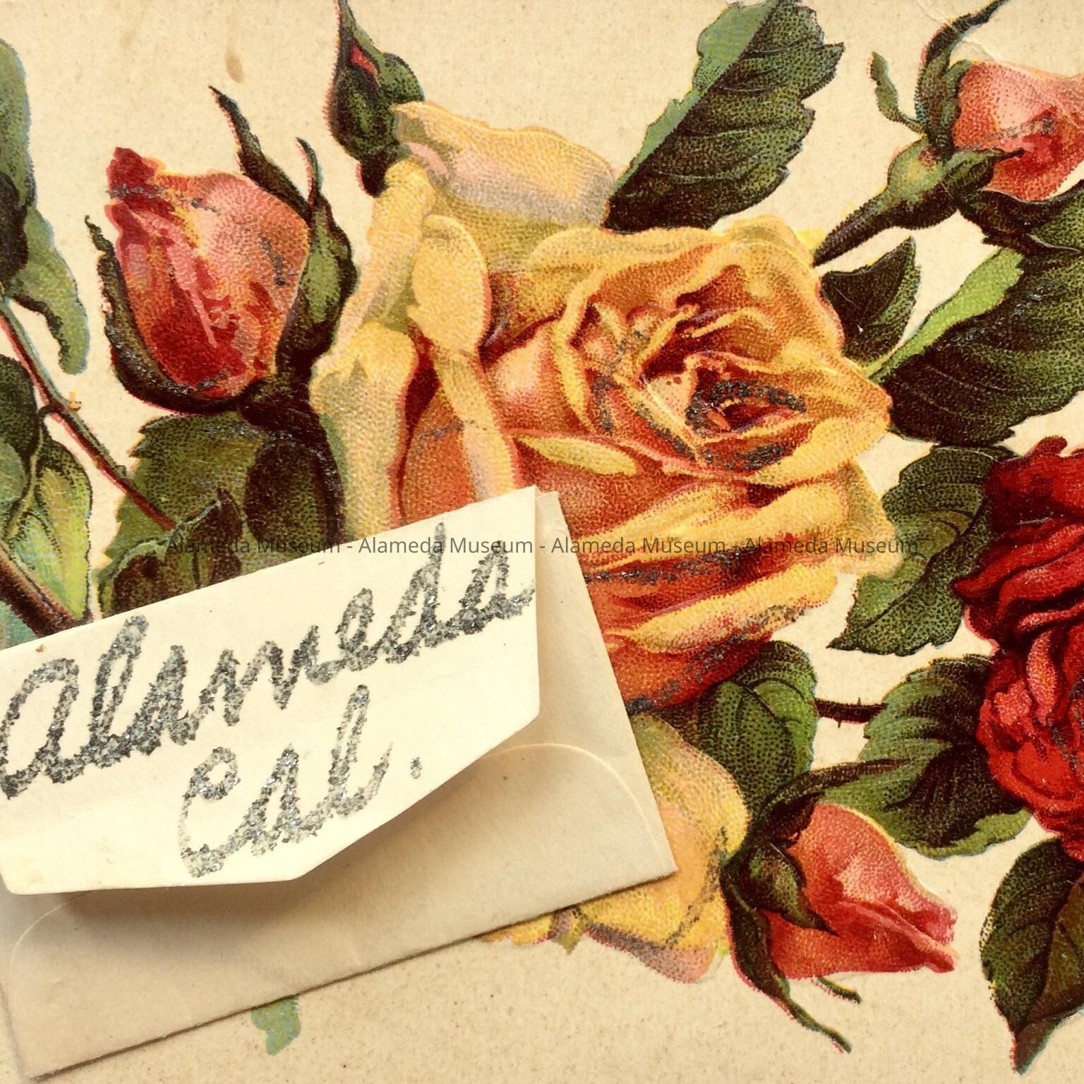 EMBOSSED CHROMOLITHOGRAPHIC POSTCARD DEPICTING ROSES ACCENTUATED WITH GLITTER. CARD WAS PRINTED IN GERMANY , THE ILLUSTRATED SIDE OF THE POSTCARD DISPLAYS A SMALL ATTACHED ENVELOPE THAT READS, "ALAMEDA, CAL." IN SILVER COLORED GLITTER.