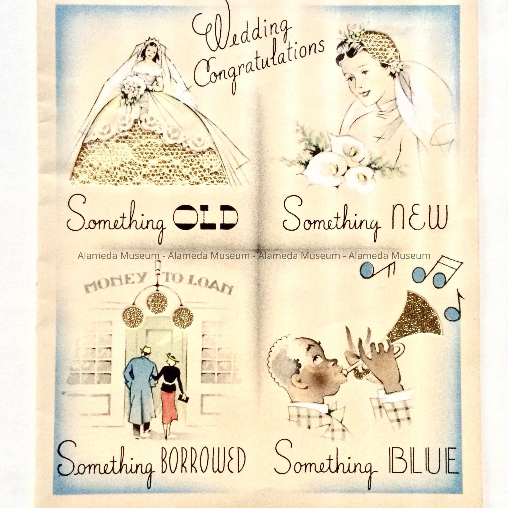 B. Card with caption 'Wedding Congratulations', divided in four sections, with designs cut out and backed with gold foil and lace. The four sections have captions: 'Something Old' (a wedding dress), 'Something New' (flowers), 'Someting Borrowed' (Money to Loan), and 'Something Blue' (a enchanting but caricatured image of an African American Jazz player. Sender: Lueiaella [?]. Holland, U.S.A.