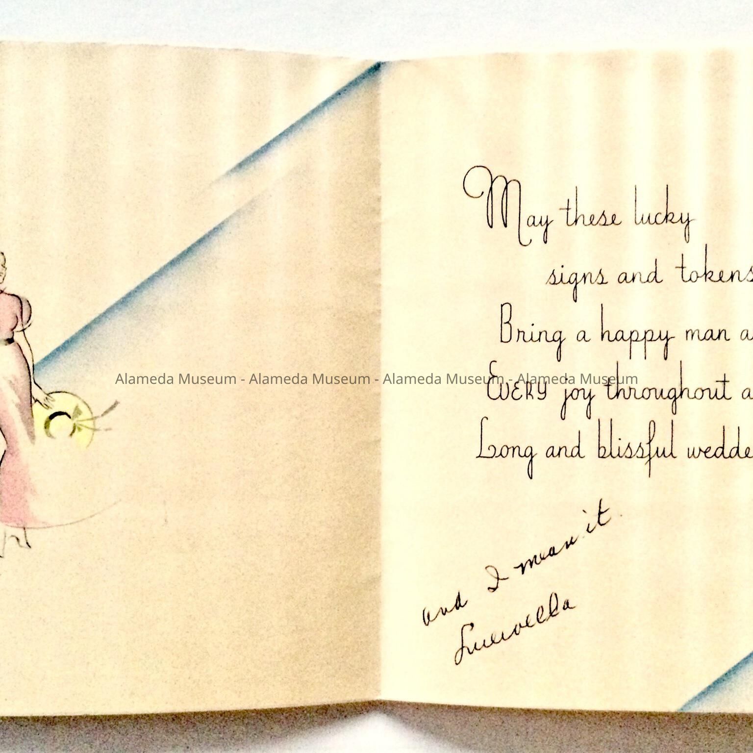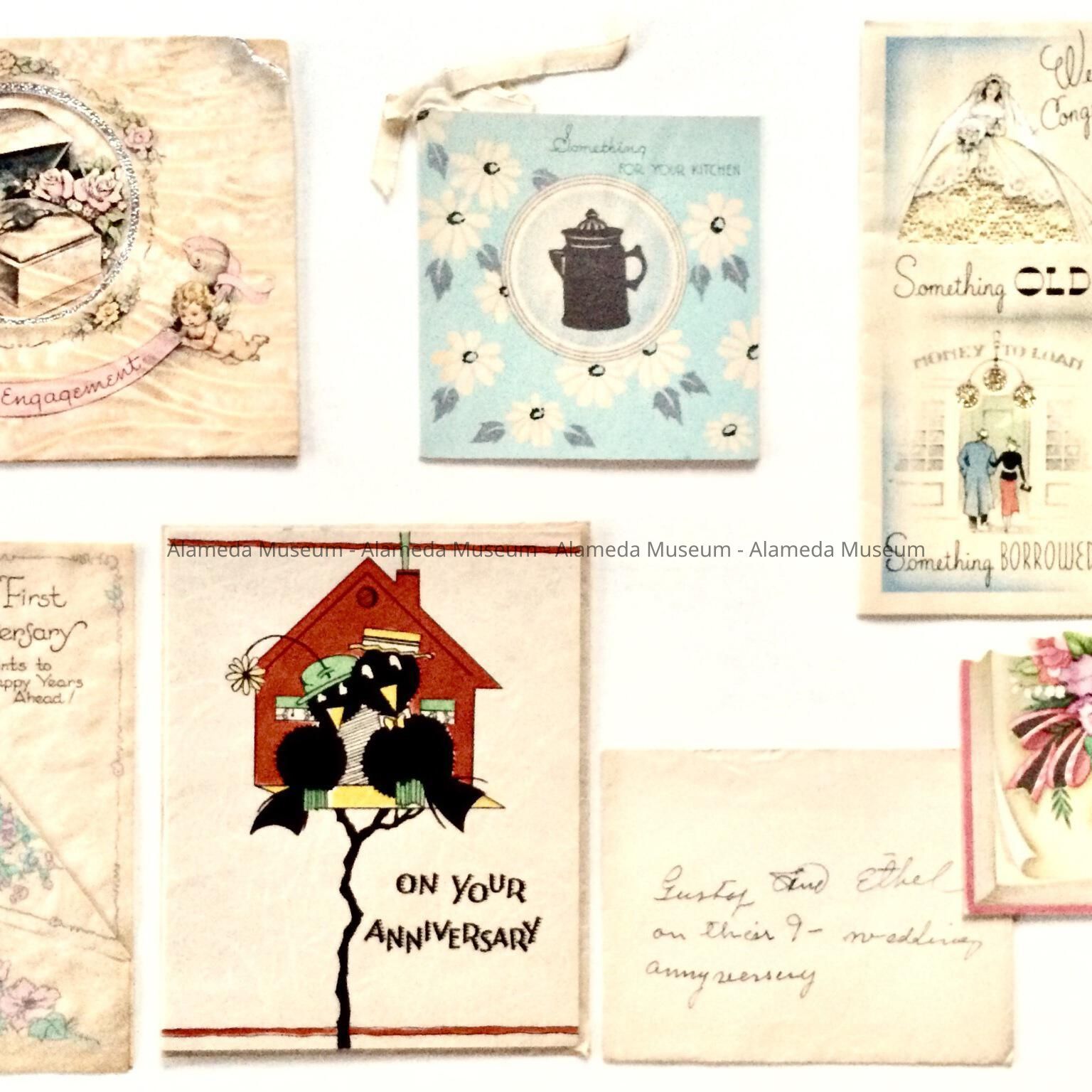 History of Object: Collection of cards relating to the marriage of Ethel Oberg and Gustaf Ekberg, August 30, 1937. Some of these may have been part of a scrapbook, judging by glue remnants. A, c. 1936, B, C, 1937, D, E, 1938, F, 1946. This collection was found in the warehouse in 2021 and was cataloged retro-actively.