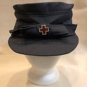 UNIFORM CAP MADE OF GABARDINE IN A BLUE-GREY COLOR. FRONT OF CAP HAS A BOW LOCATED ABOVE THE BILL VISOR. A WHITE- AND RED-COLORED ENAMEL AMERICAN RED CROSS PIN IS POSITIONED IN THE CENTER OF THE BOW. HAT SIZE, "23," HAS NO MANUFACTURER'S LABEL THEREON.