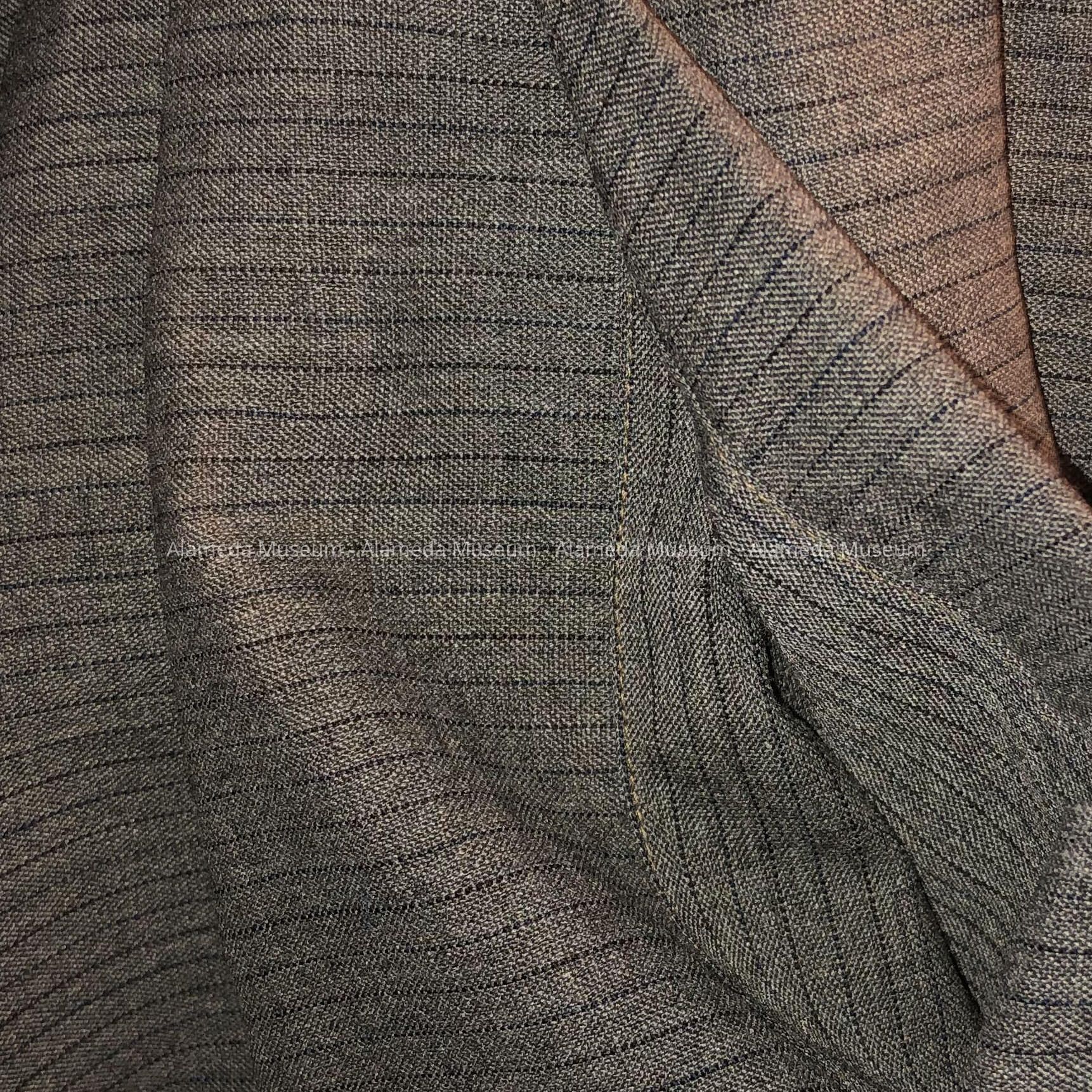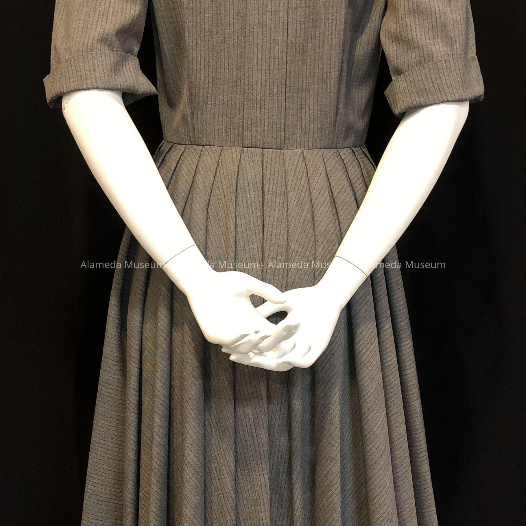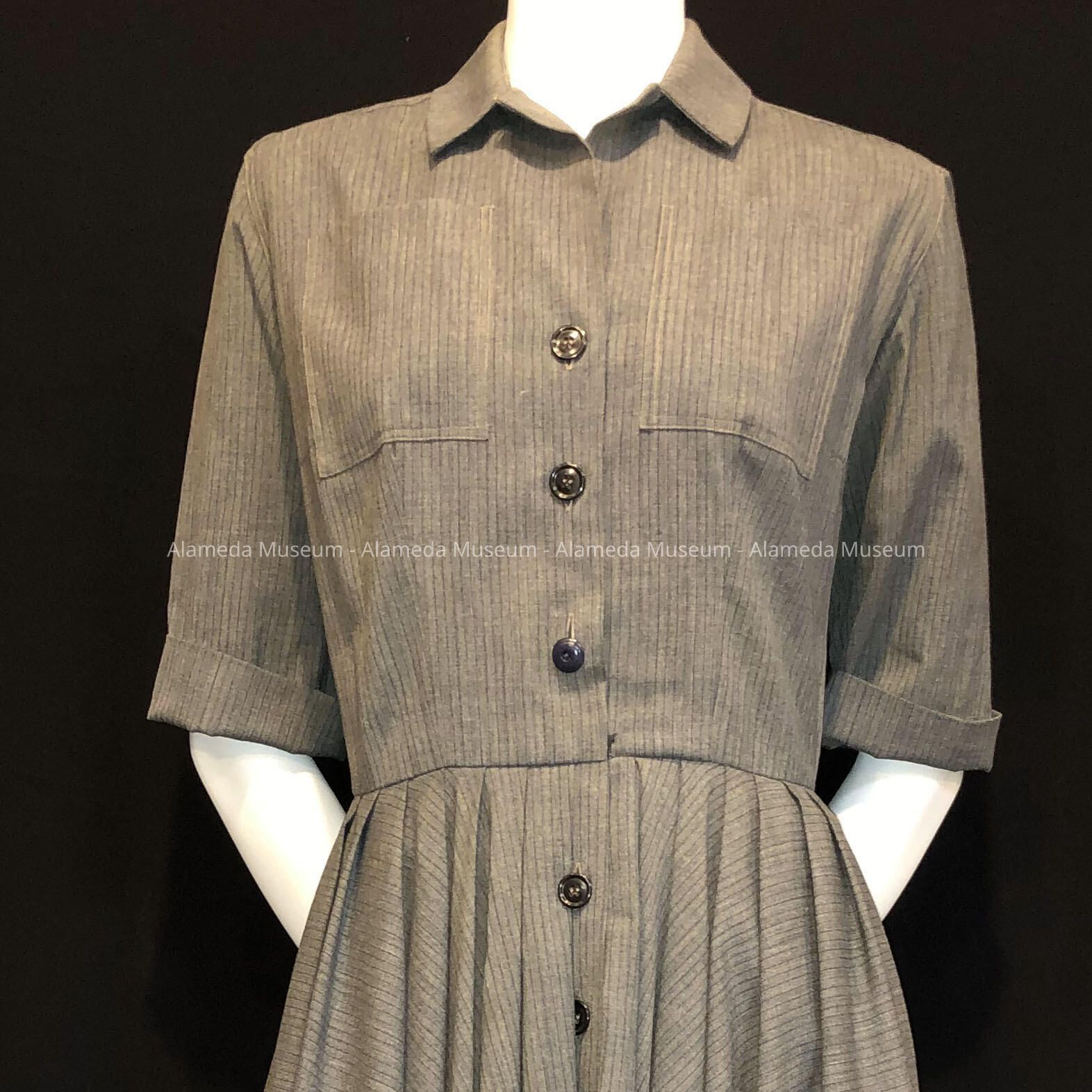 TAILORED DRESS OF A STRIPED GREY FABRIC, REMINISCENT OF CLOTH USED IN A MAN'S SUIT. FRONT OF DRESS IS SECURED BY FIVE PLASTIC BUTTONS, QUARTER-LENGTH SLEEVES AND ROLLED-UP CUFFS. MASCULINE COLLAR, WITH BREAST POCKETS. SKIRT IS FULL-PLEATED.