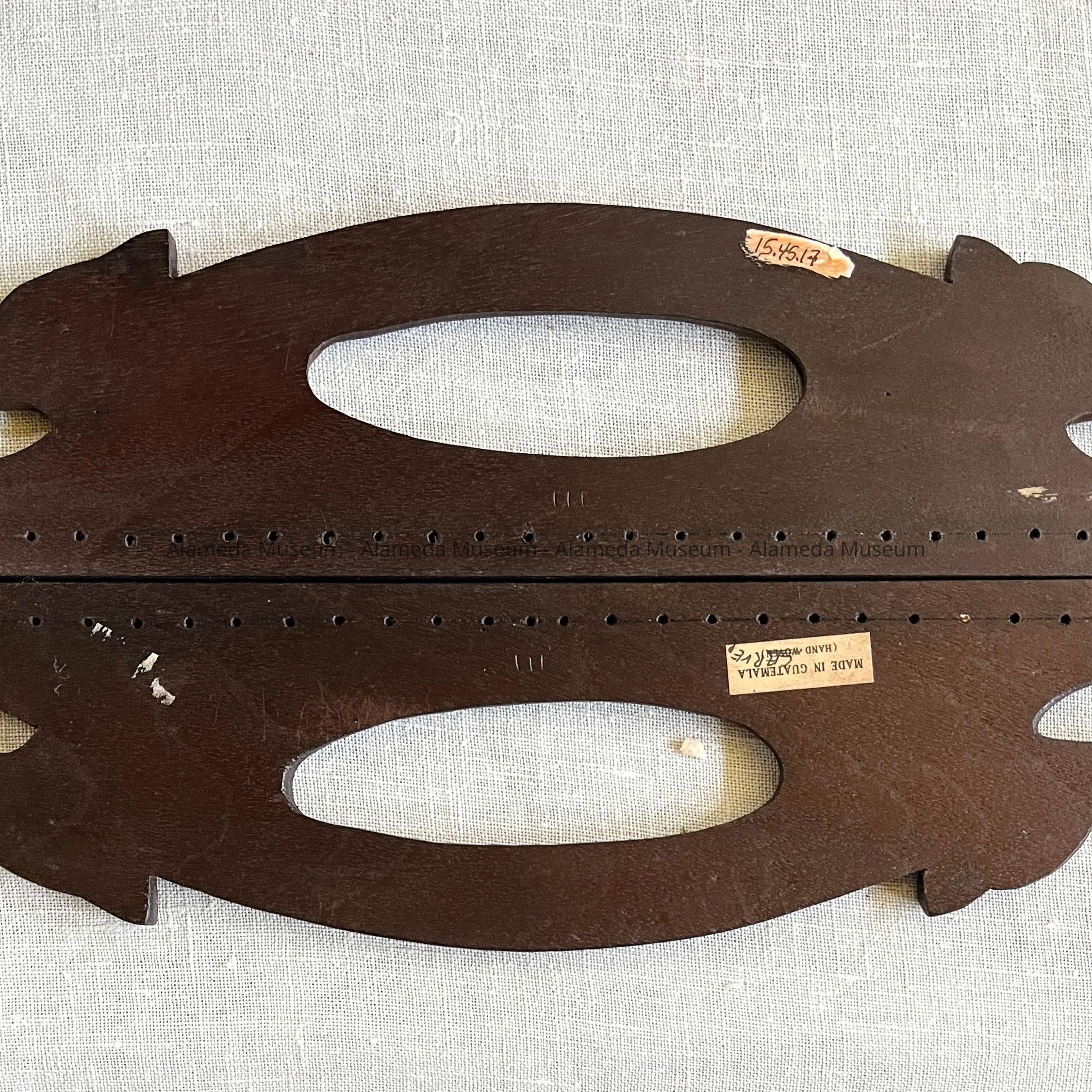 DESCRIPTION: A HAND CARVED WOODEN-POSSIBLY MAHOGANY-PURSE OR VALISE OR BAG GRIP. LOWER SECTION IS PIERCED TO ASSURE THAT FABRIC CAN BE ATTACHED TO THE GRIP BY HAND. ITEM HAS A PAPER LABEL, "MADE IN GUATEMALA."