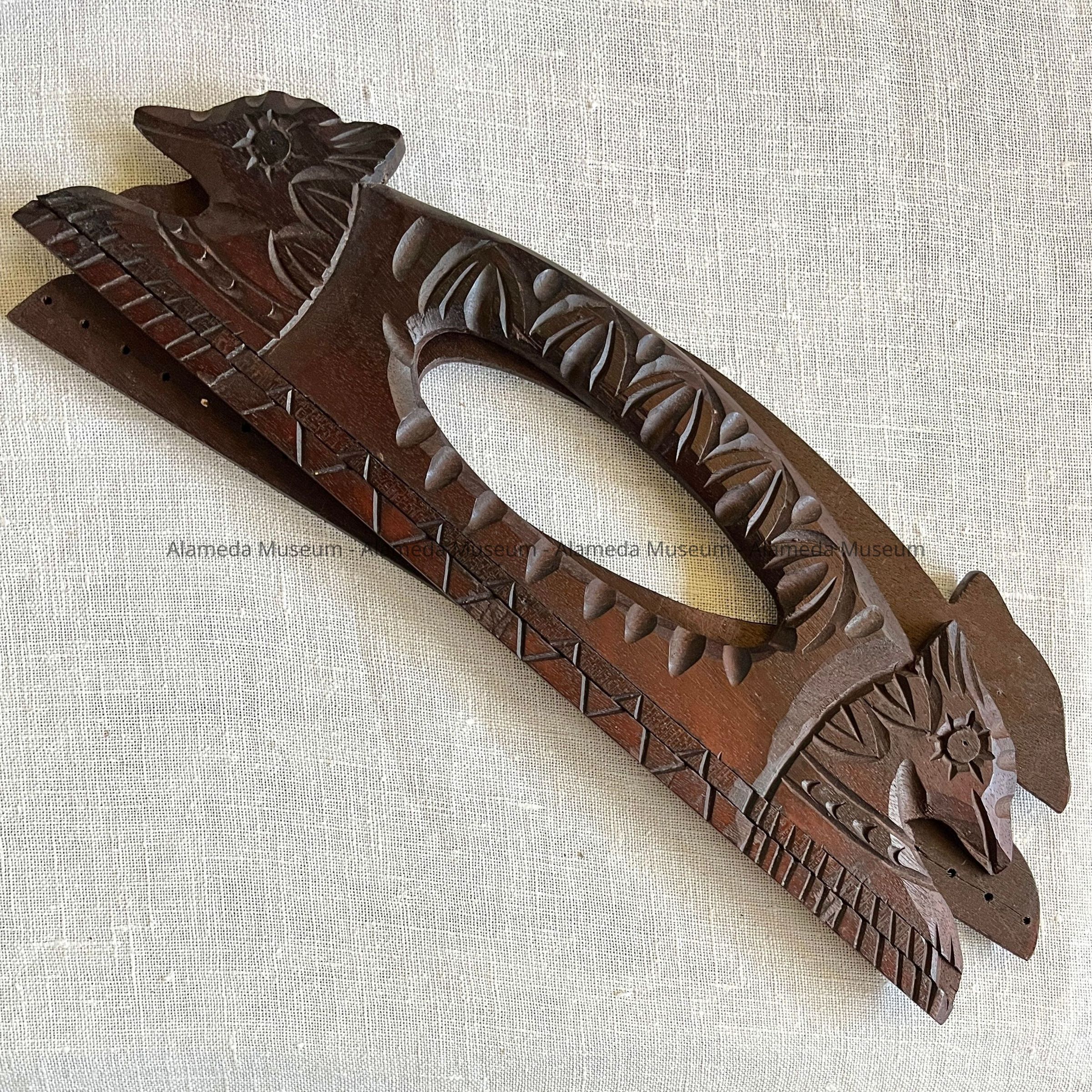 HISTORY OF OBJECT: A CARVED PURSE OR SEWING BAG HANDLE PURCHASED BY THE MEYERS' SISTERS WHILE TRAVELING IN CENTRAL AMERICA.