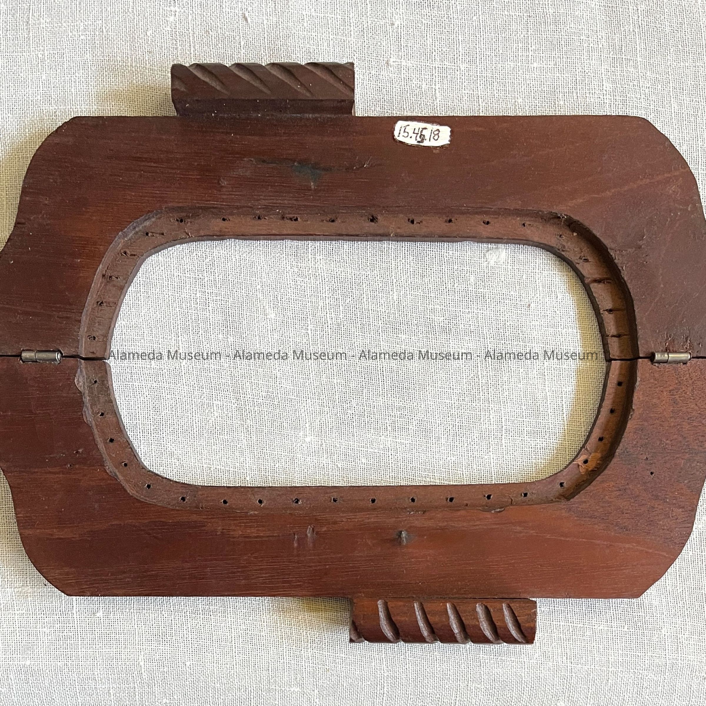 DESCRIPTION: A HAND CARVED WOODEN-POSSIBLY MAHOGANY-HINGED PURSE OR VALISE OR BAG GRIP WITH DARK FINISH.