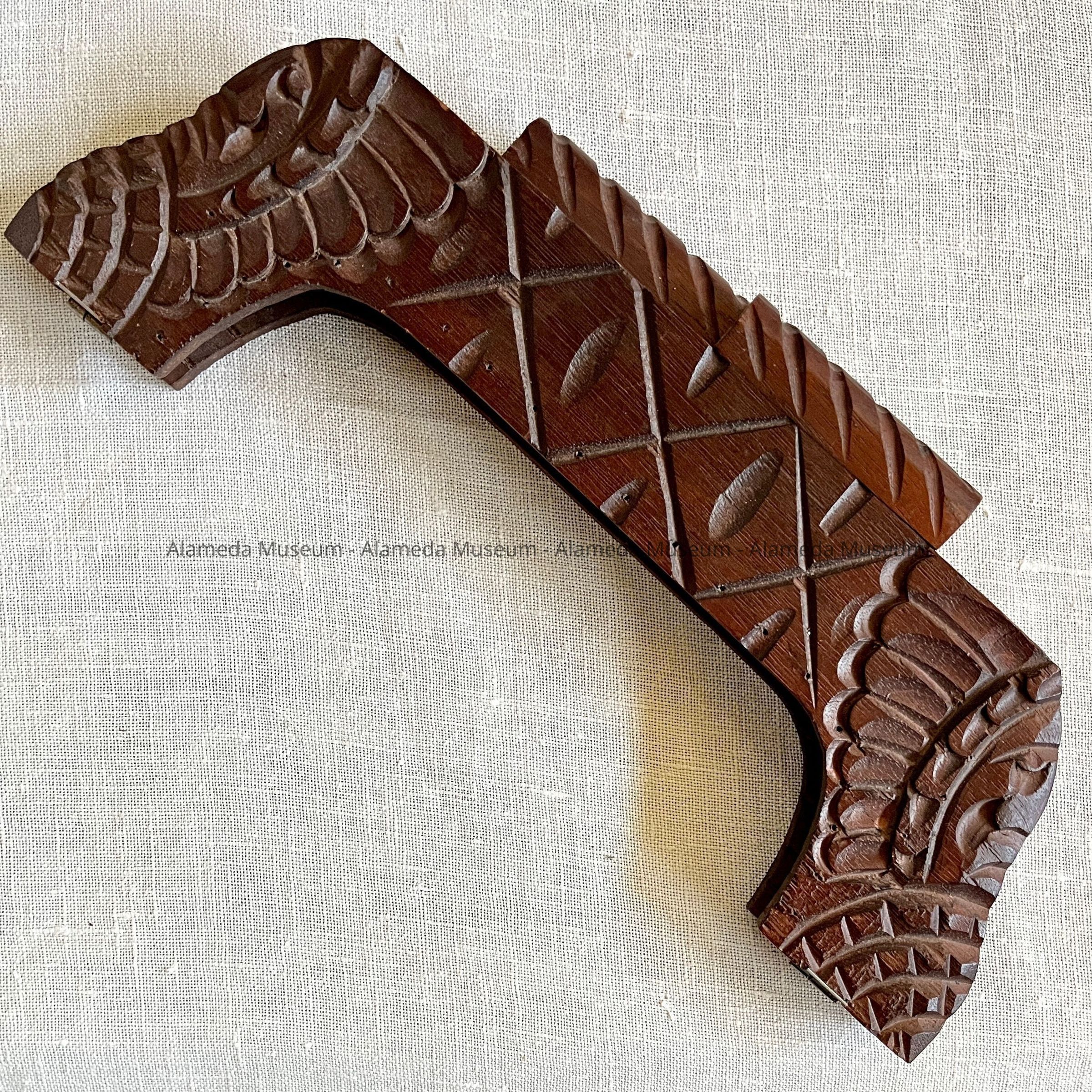 HISTORY OF OBJECT: A CARVED PURSE OR SEWING BAG HANDLE PURCHASED BY THE MEYERS' SISTERS WHILE TRAVELING IN CENTRAL AMERICA.