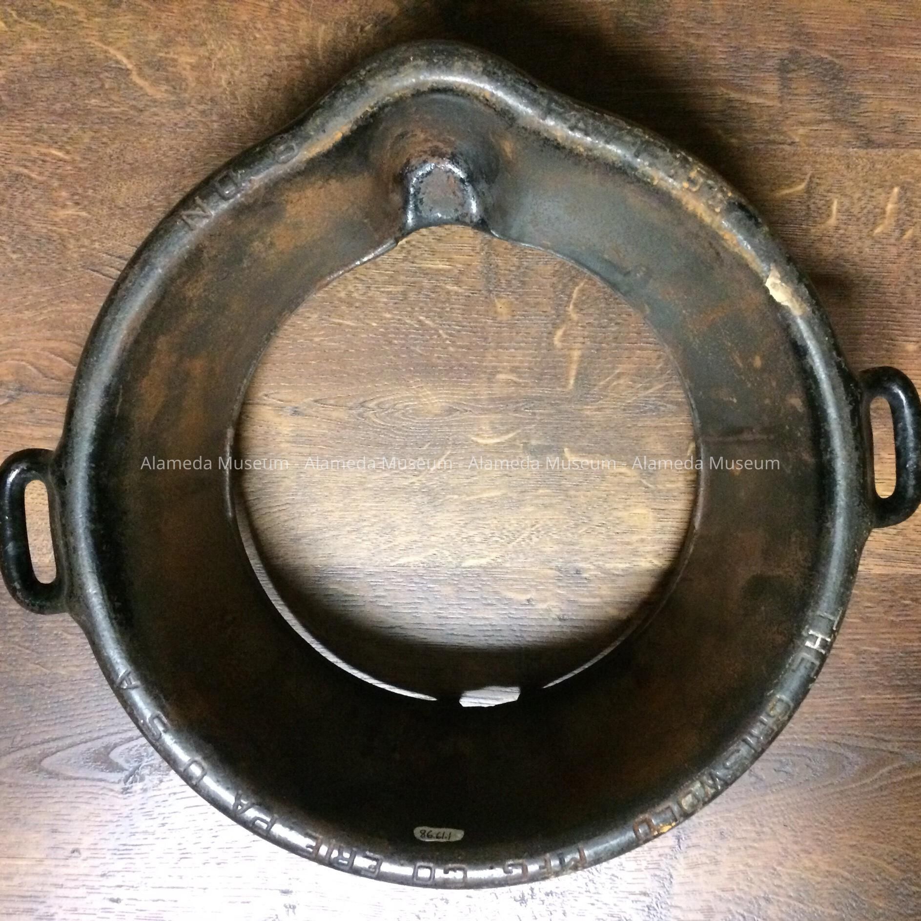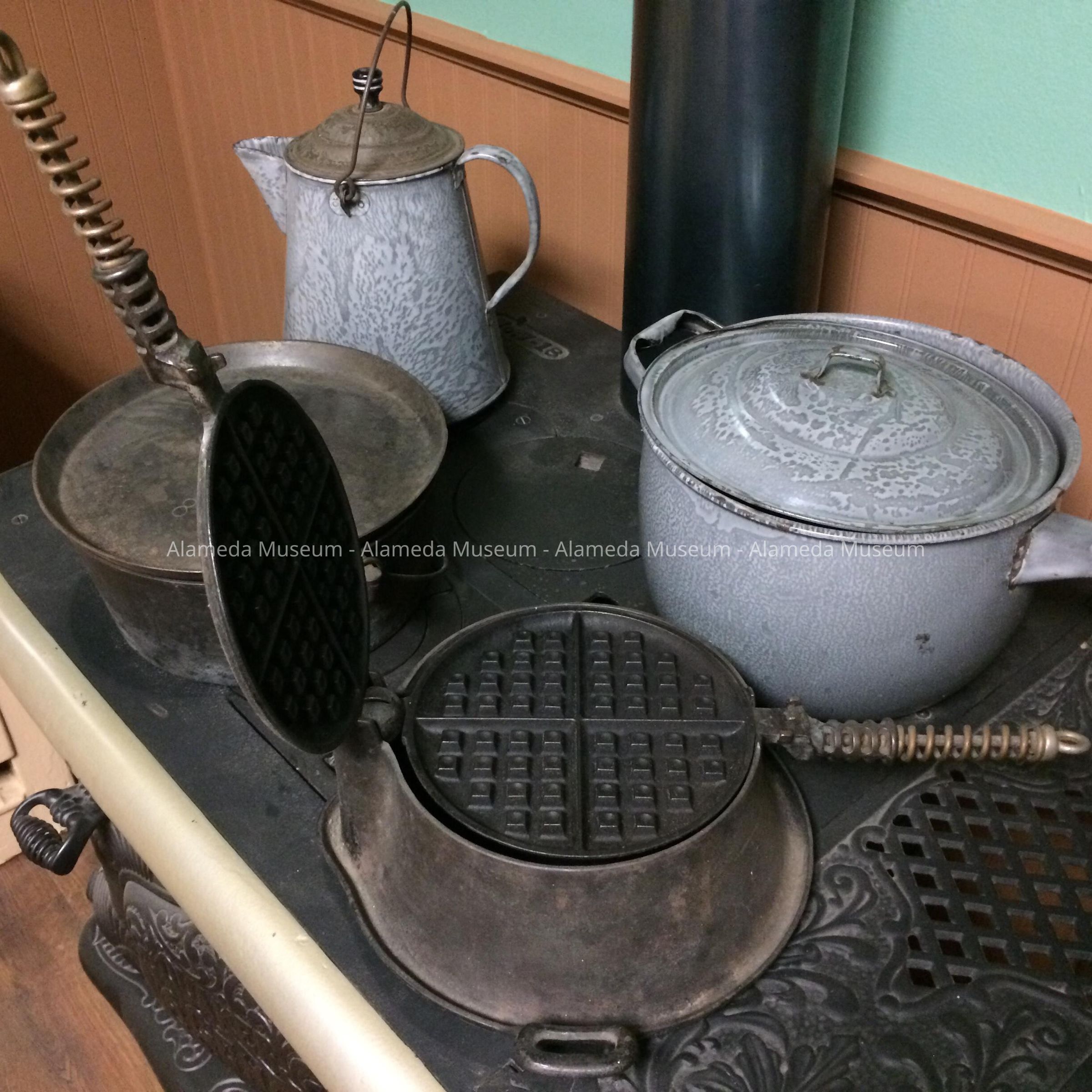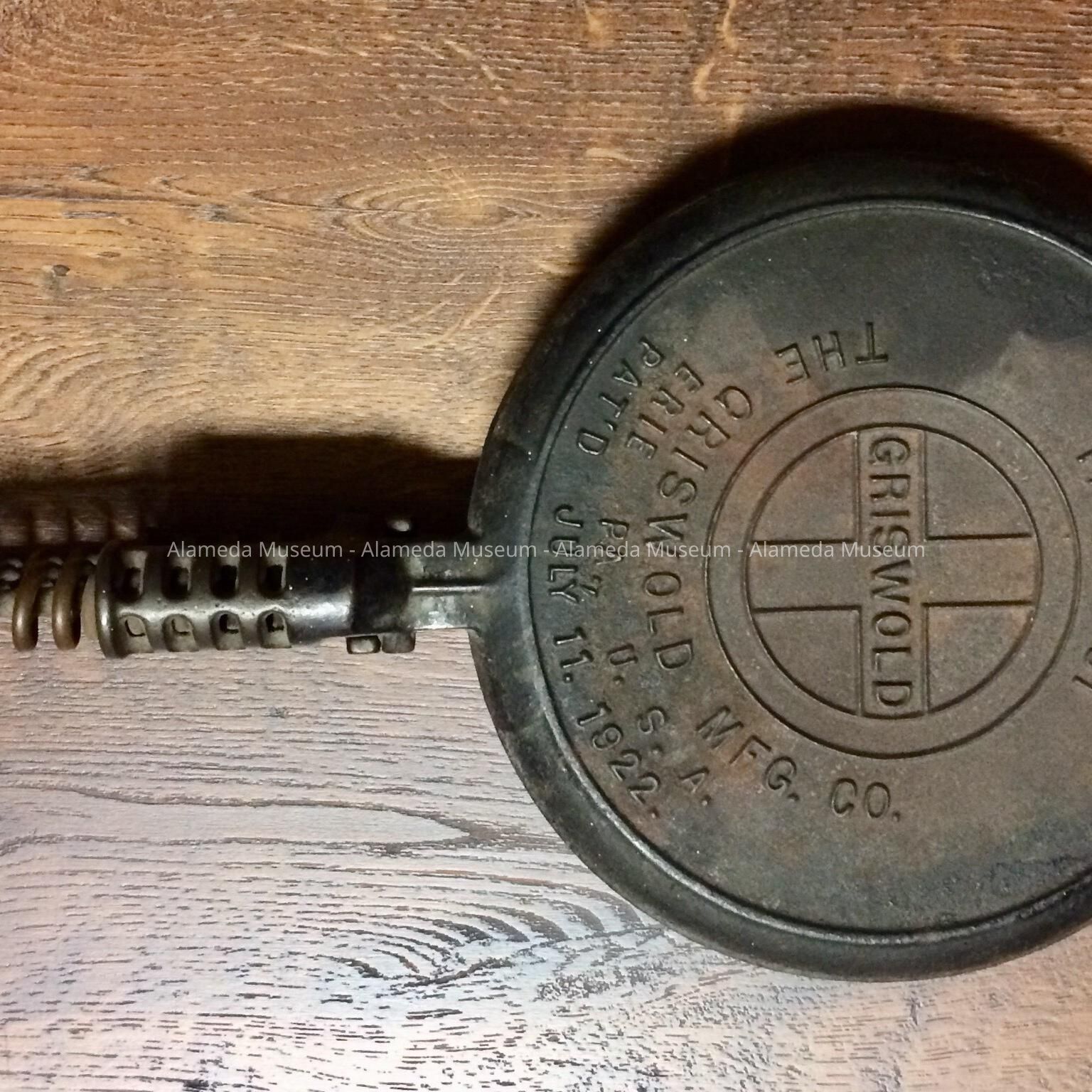 History of Object: old-time stove-heated waffle iron which originally belonged to Mr. & Mrs. Donald McLean of Bay Street. Mr. McLean’s mother was a daughter of James Millington, pioneer carpenter & City Clerk of Alameda. Mr. Millington & wife, Lydia, settled here in the early 1850's. The donor's wife (Marge) is the daughter of Donald & Eleanor McLean.