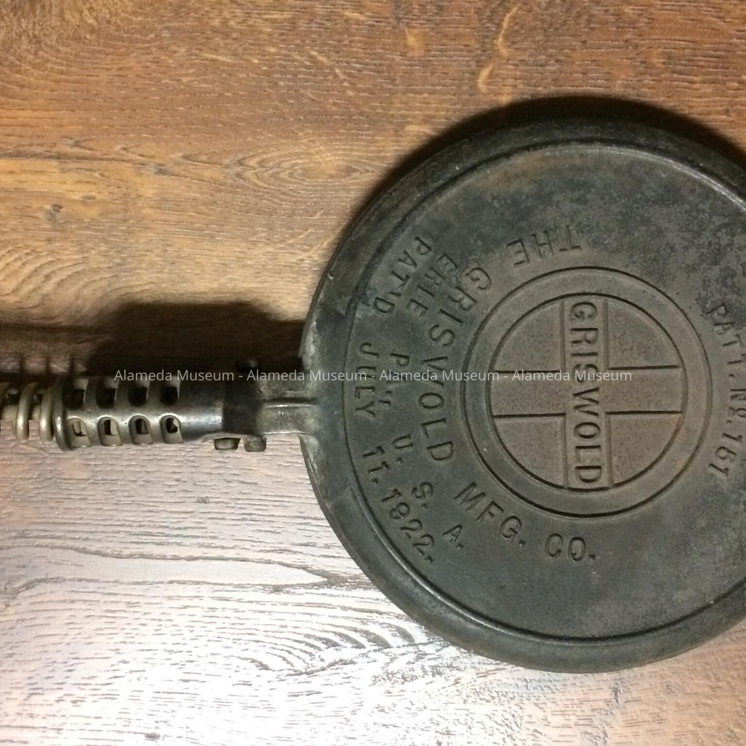Waffle iron signed with raised cast lettering stating "American No. 8, Patt. No. 151, Griswold, The Griswold Mfg. Co., Erie, Pa,, U.S.A., Pat'd- July 11, 1922."