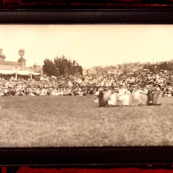 History of Object: Oblong photo depicting Alameda Day, 1915, World's Fair, San Francisco (P.P.I.E). Included in the group photo is the donor, his mother, Mrs. Trudgett, and his brother, Dudley Trudgett, who had participated in the event.