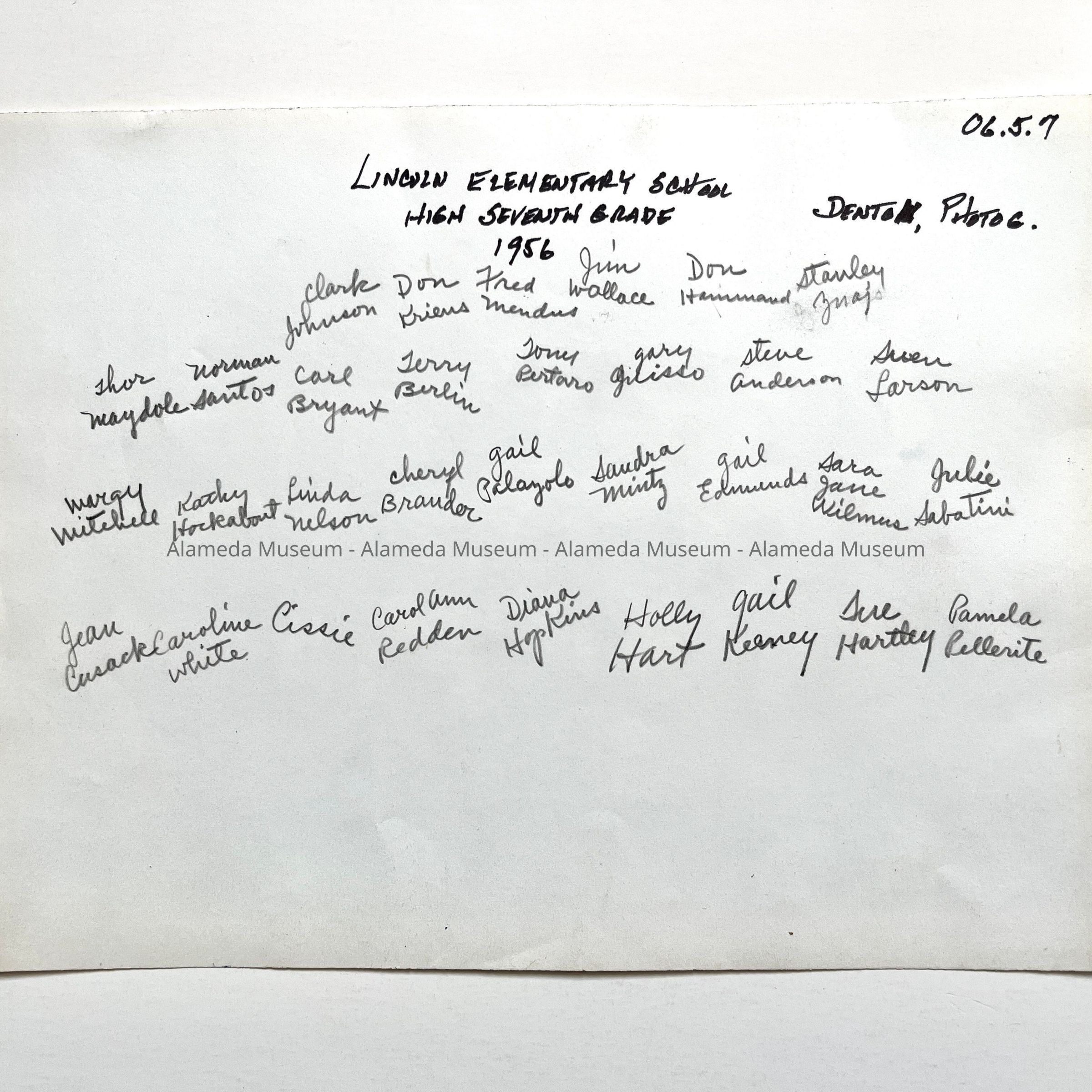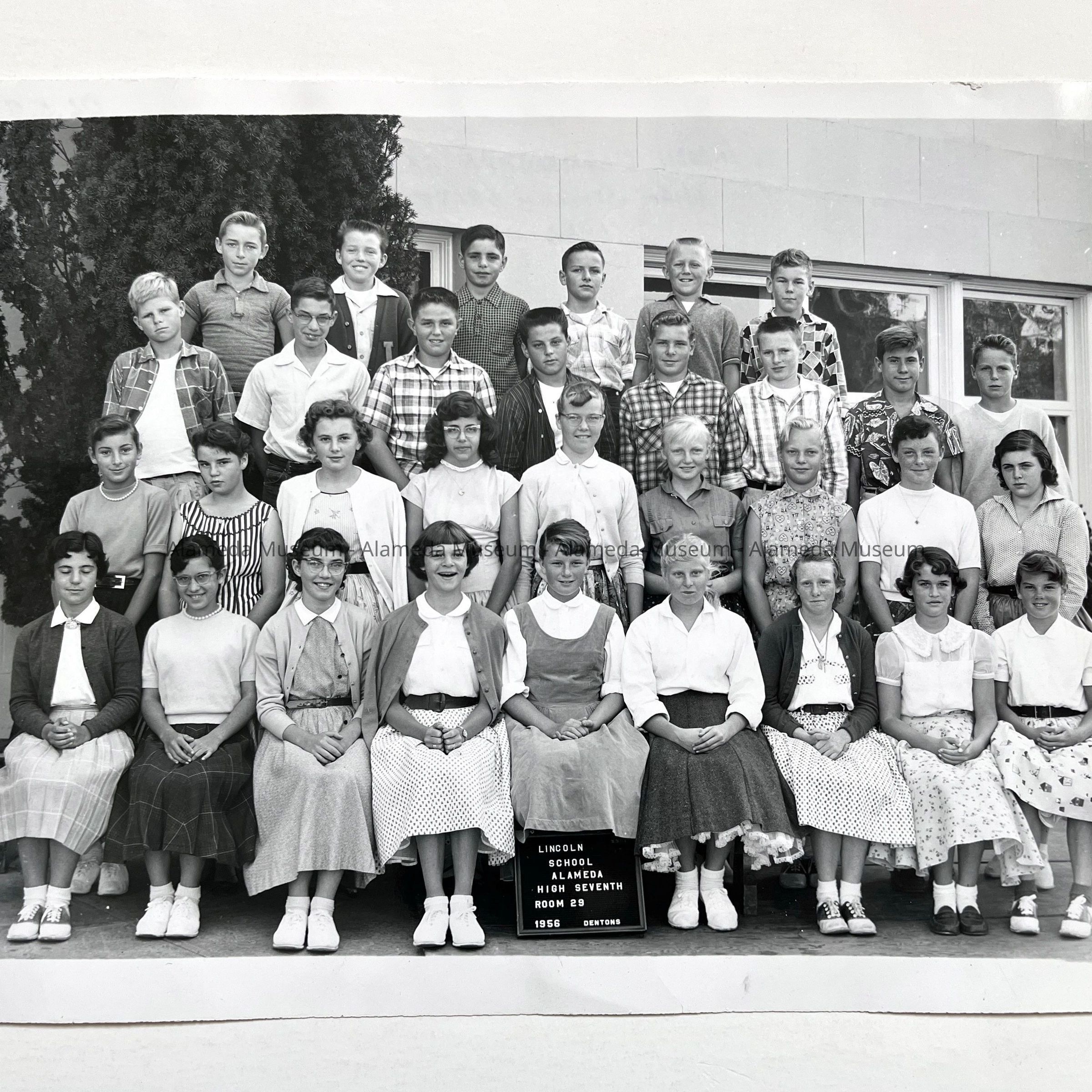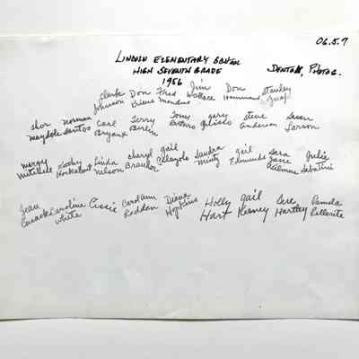 History of Object: Group photo of Lincoln Elementary School high seventh grade class of 1956, located in Room 29. (See card 06.5.1 for donor's family details.) The students' names are written on the verso.