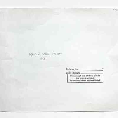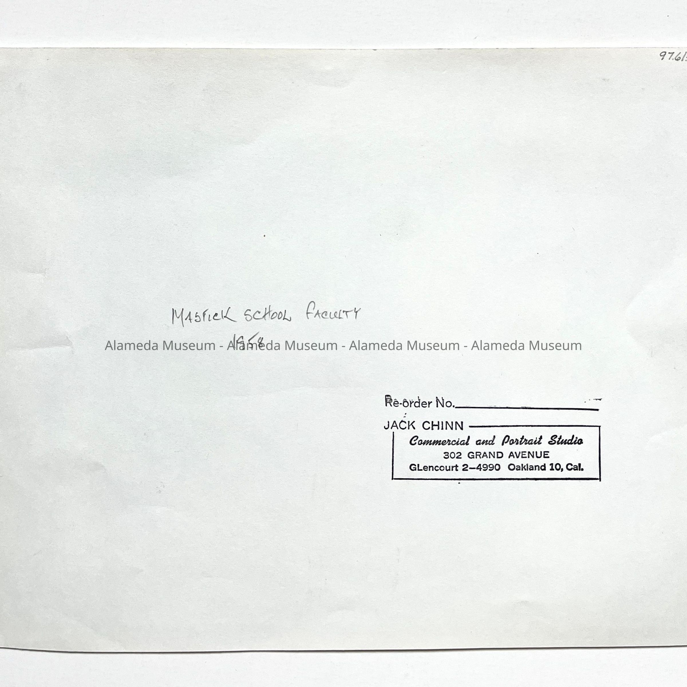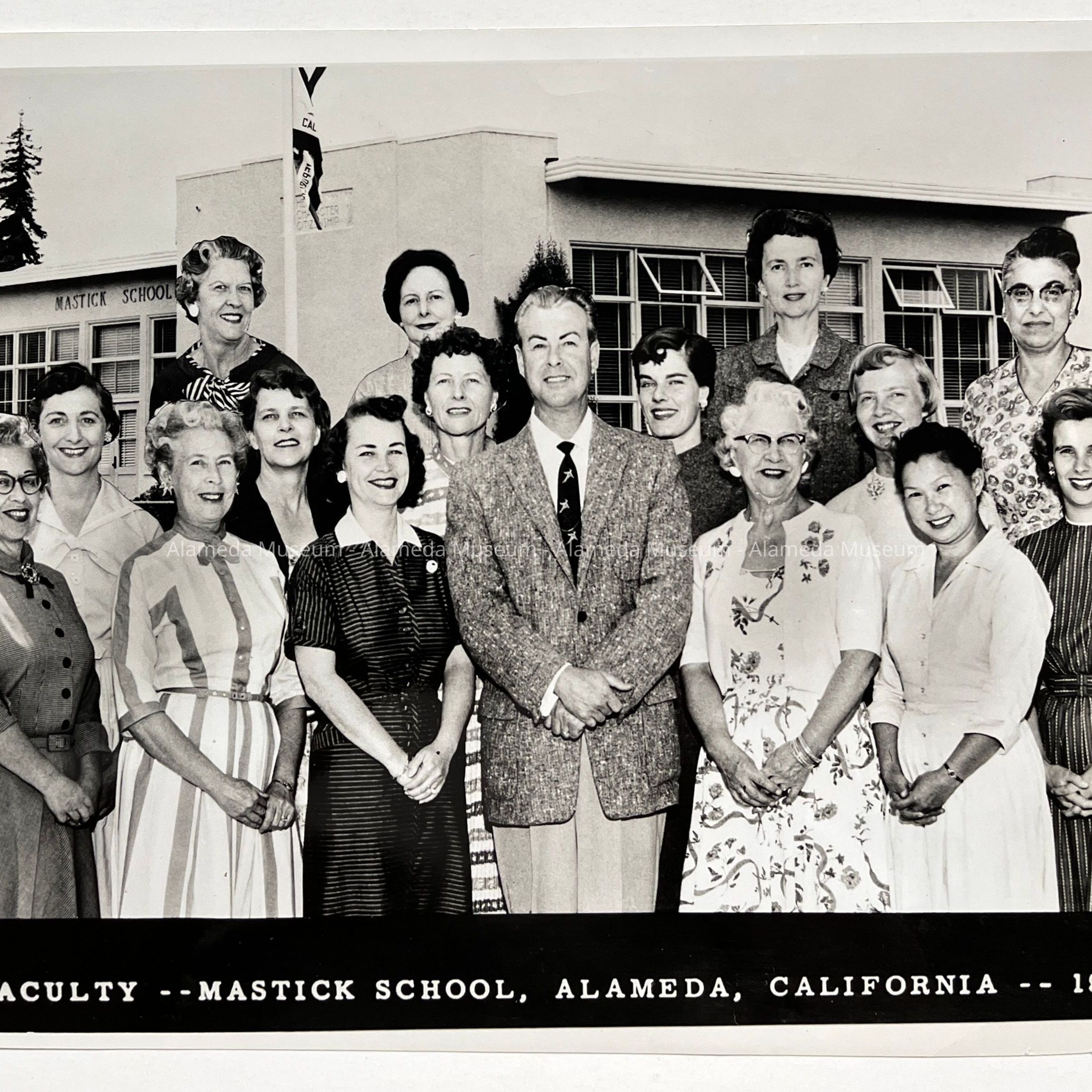 BLACK-AND-WHITE PHOTOGRAPH, WITH CAPTION, "FACULTY IN MASTICK SCHOOL, ALAMEDA, CALIF, 1958." SIGNED ON REVERSE SIDE, "JACK CHINN, PHOTOGRAPHER, OAKLAND."