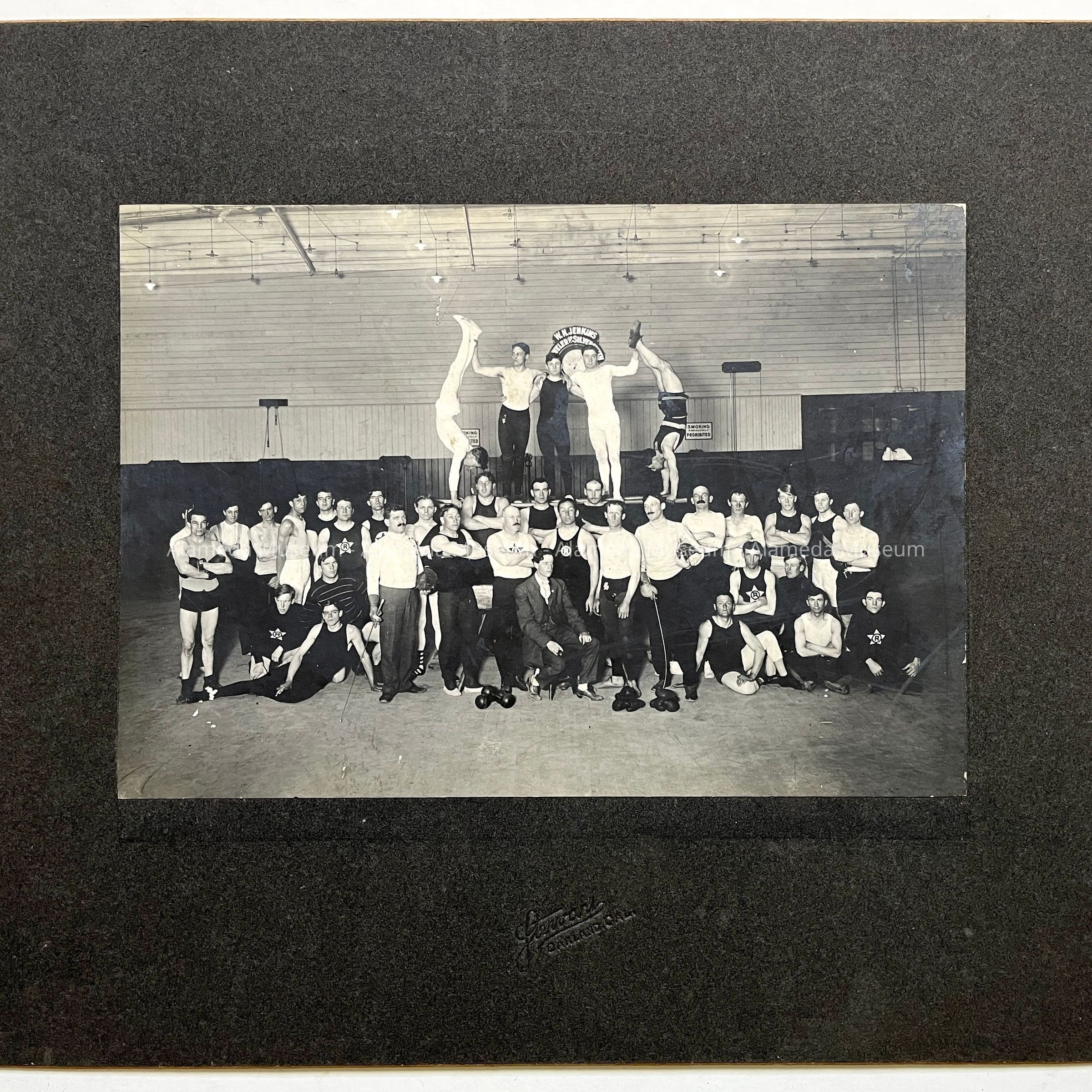 Description: Black and white photograph, mounted on charcoal gray paper board. Pictured are members of the Oakland Reliance Club (name of club is handwritten on back). Members are posed standing in front of five men who have assumed stances on gym bars. Otto Rittler is standing in front row, wearing dark tank top, arms folded. Photograph is embossed with photographer's name, Stewart, Oakland, Cal.