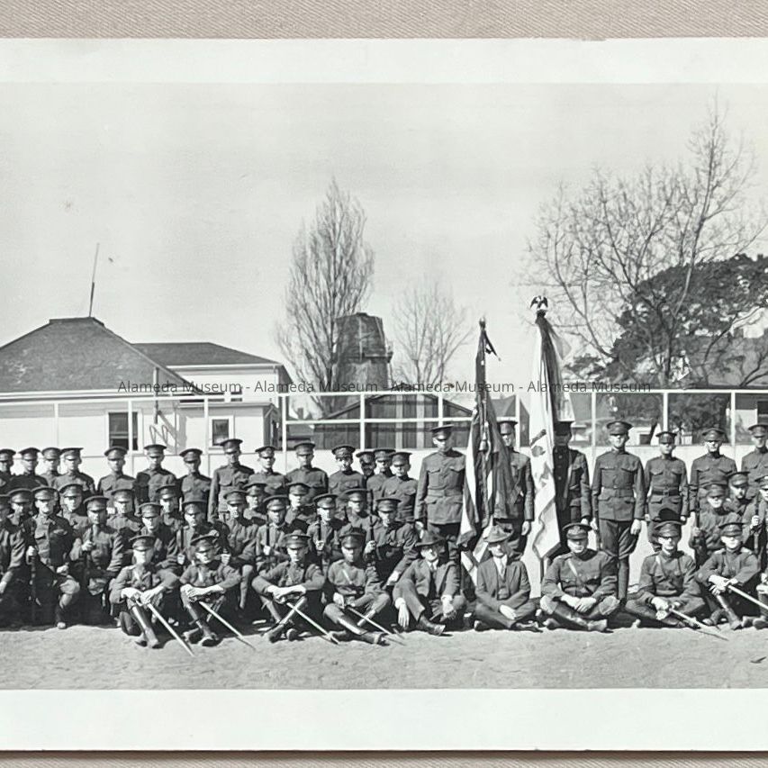 History of Object: The Alameda High School Reserve Officers Training Corp (ROTC) assembled for a group photo on the grounds of the Porter School, the site at which they drilled.