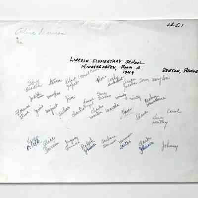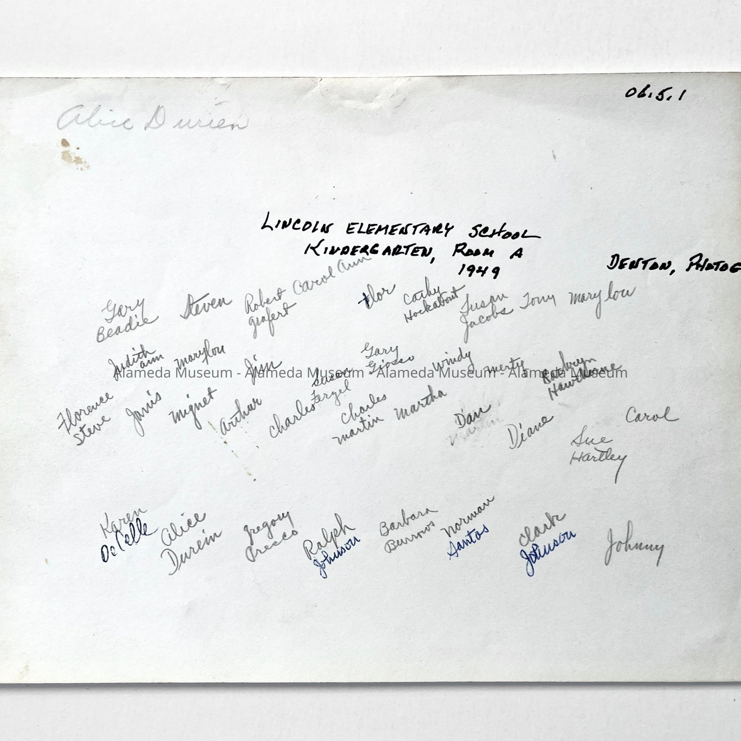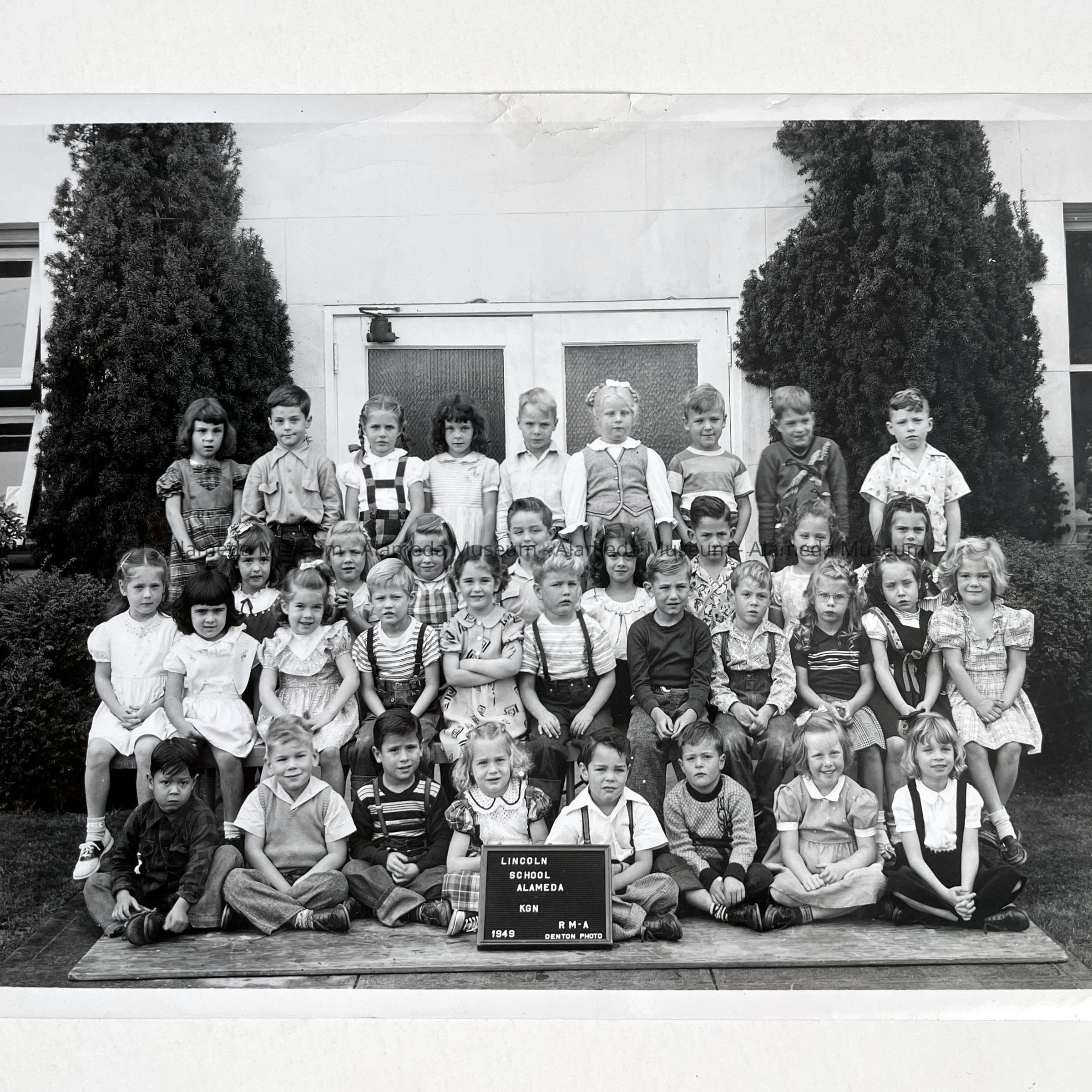 History of Object: Group photo of Lincoln Elementary School kindergarten of 1949. The student’s names are written on the verso. The donor, Doug Durein, was the son of the late Alice and Joseph Durein (the latter was a past president of the Alameda Historical Society). The Durein family came to Alameda in the 1860's, at one time running a shoe store on Park Street.