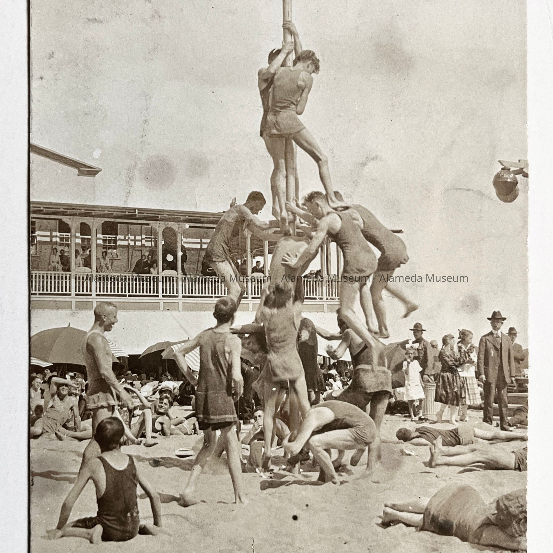 PHOTOGRAPH OF GROUP OF MEN TRYING TO SCALE A POLE AT NEPTUNE BEACH, ALAMEDA, CALIFORNIA.
