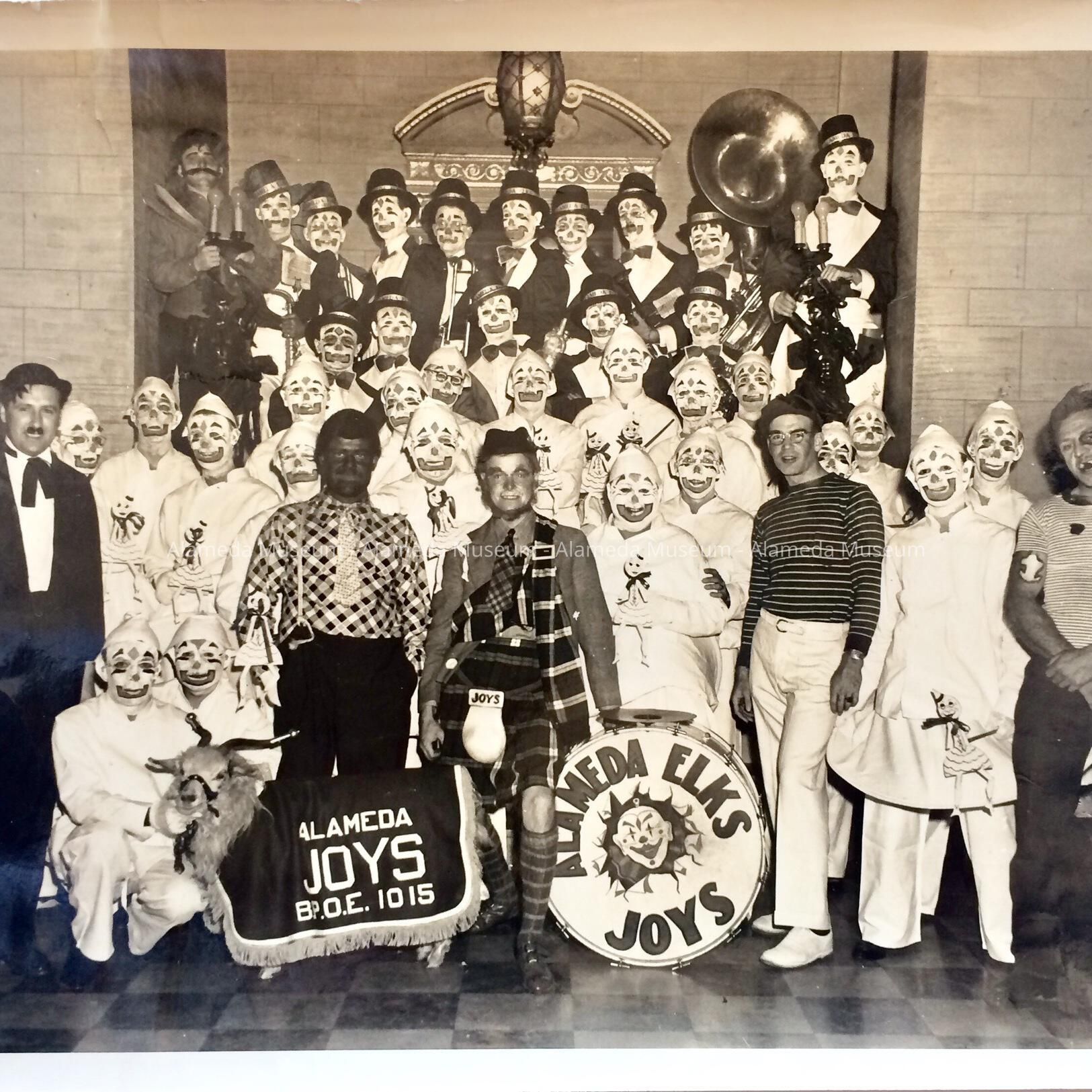 Description: High Gloss black-and-white photo of a group of people dressed up for an event or performance; including a mustachioed man made up with black face paint, and including a live goat mascot wearing a cover stating 'Alameda Joys B.P.O.E. 1015' and a drum with 'Alameda Elks Joys'. Verso has a stamp 'from Laboratories of Frederick-Burkett Photographers, Sacramento', and handwritten in one corner 'Bill Bailey'. There is a 1" tear starting from the top left margin. The negative has been numbered '1.'