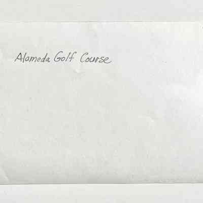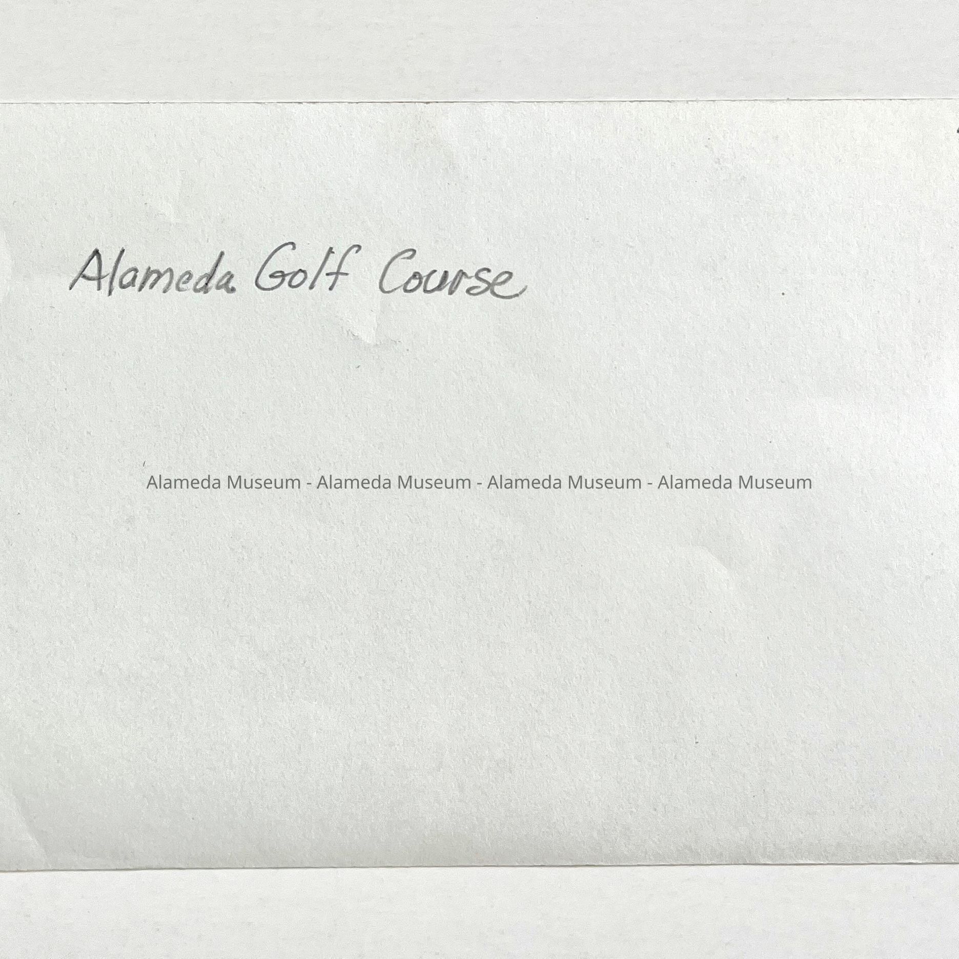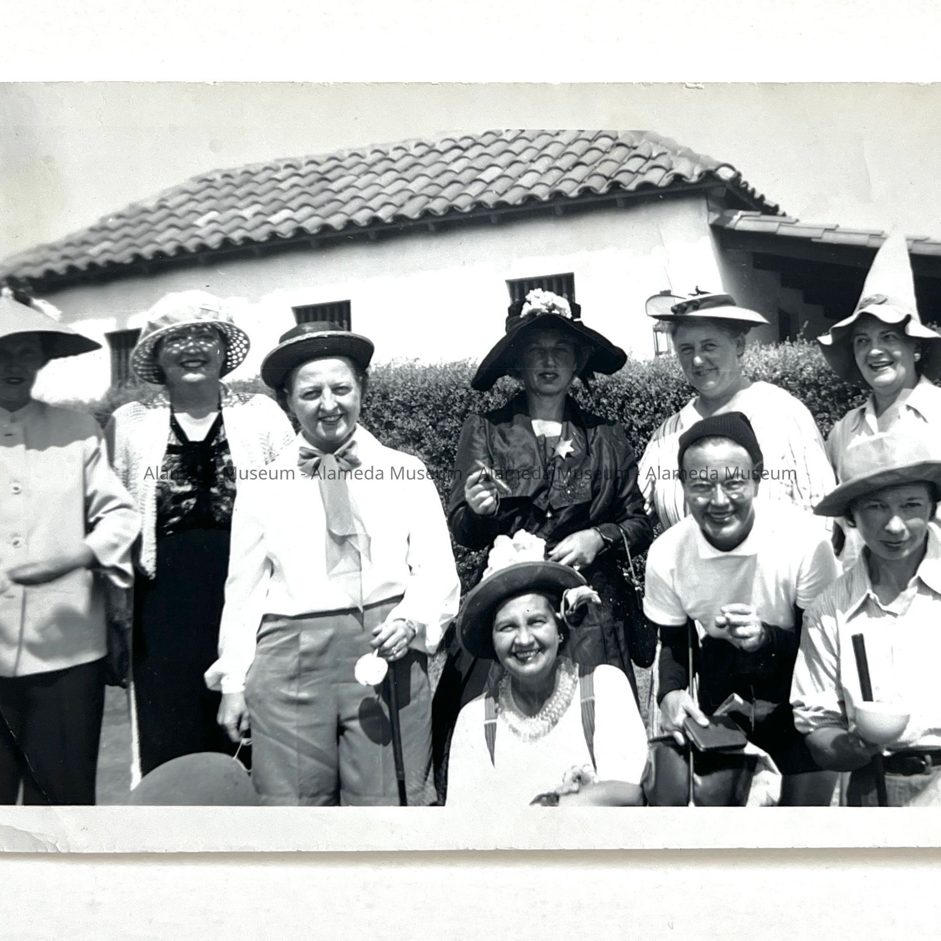 PHOTO OF A GROUP OF WOMEN GOLFERS IN COSTUMES. IN THE BACKGROUND IS THE OLD GOLF CLUBHOUSE AT THE ALAMEDA MUNICIPAL GOLF COURSE. SUBJECT WOMEN ARE NOT IDENTIFIED.