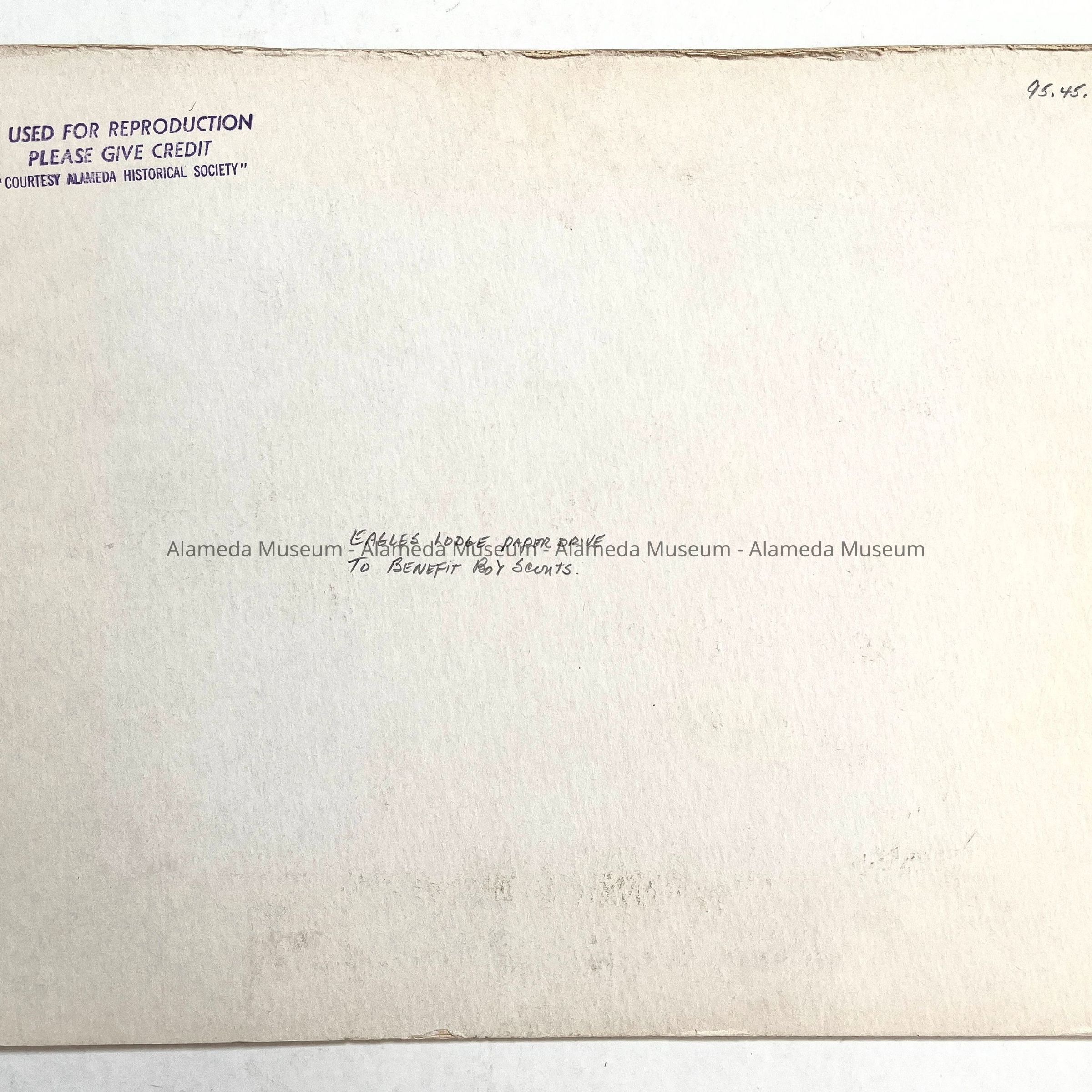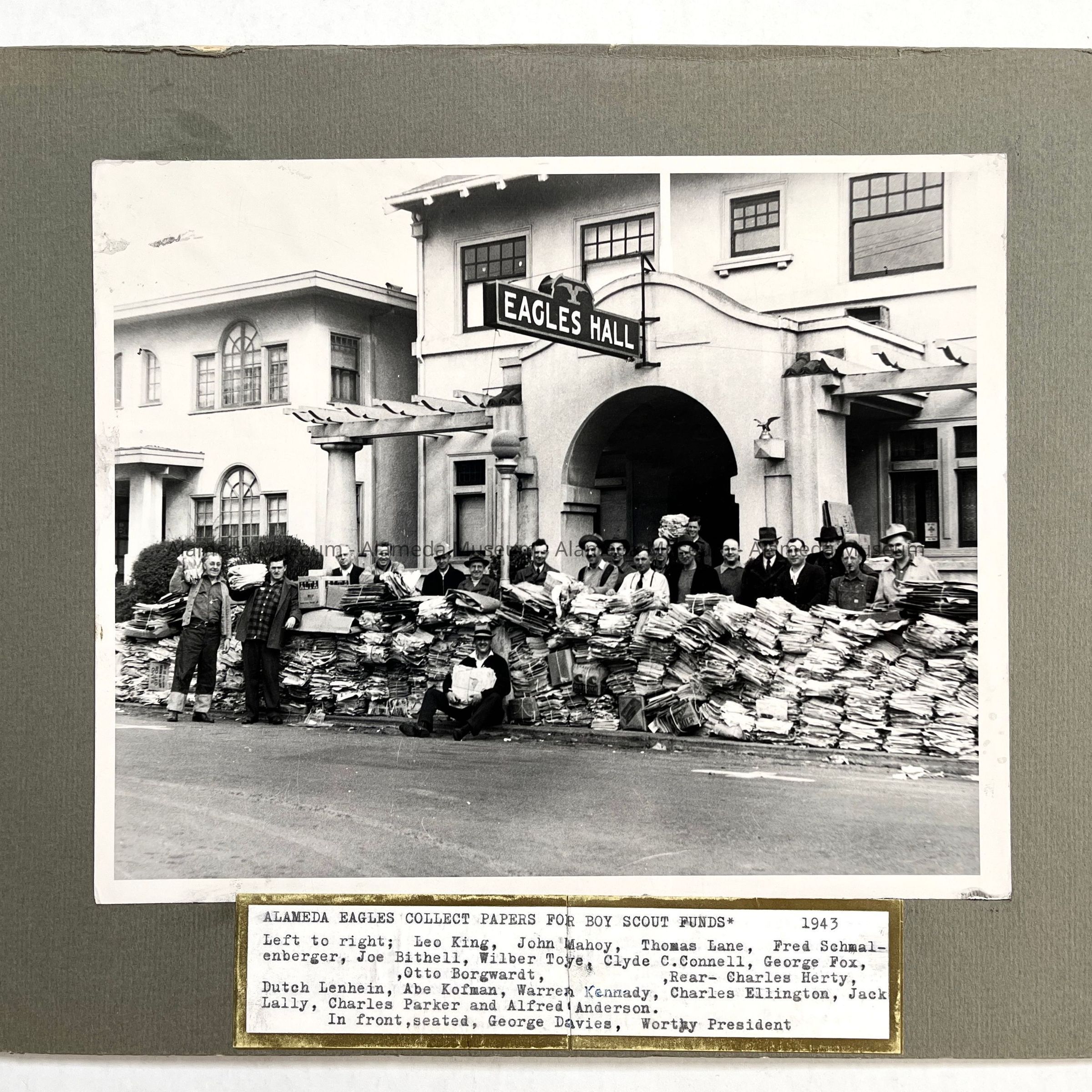 History of Object: Group photo of participants in Eagles Lodge paper drive (on behalf of the Boy Scouts) standing in front of hall amid bundles of newspapers. Label affixed below the image identifies the lodge members.