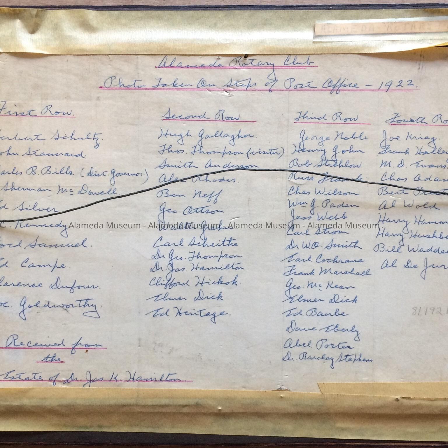 History of Object: It is a group photograph of the Rotary Club on the steps of the old post office in Alameda.
