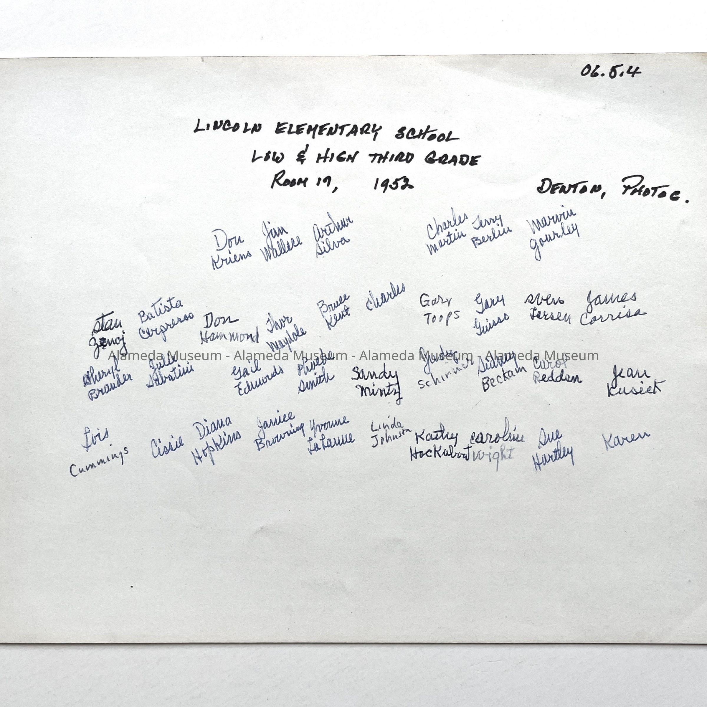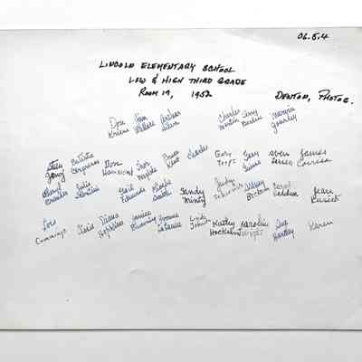 History of Object: Group photo of Lincoln Elementary School low and high third grade class of 1952, located in Room 17. (See card 06.5.1 for donor's family details.)