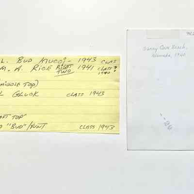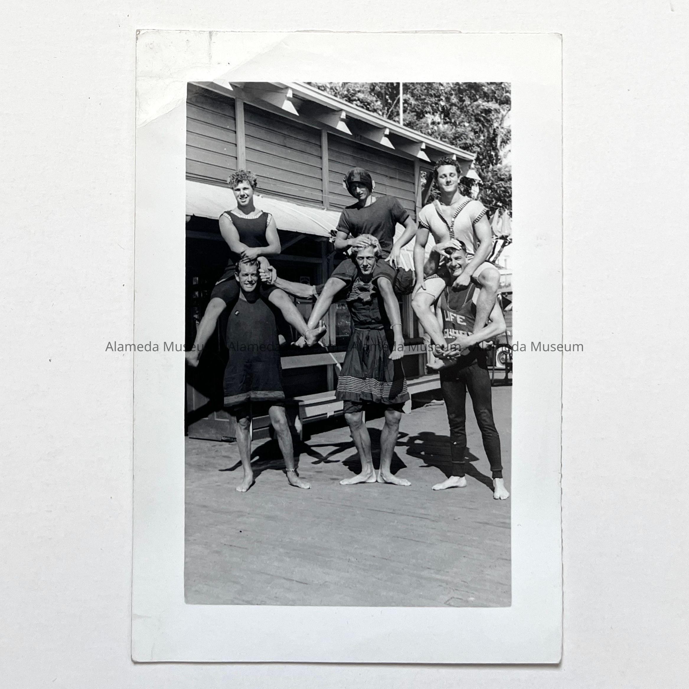 History of Object: Group photograph, including donor, of six young men clowning in old-time bathing suits, Sunny Cove Beach 1940.