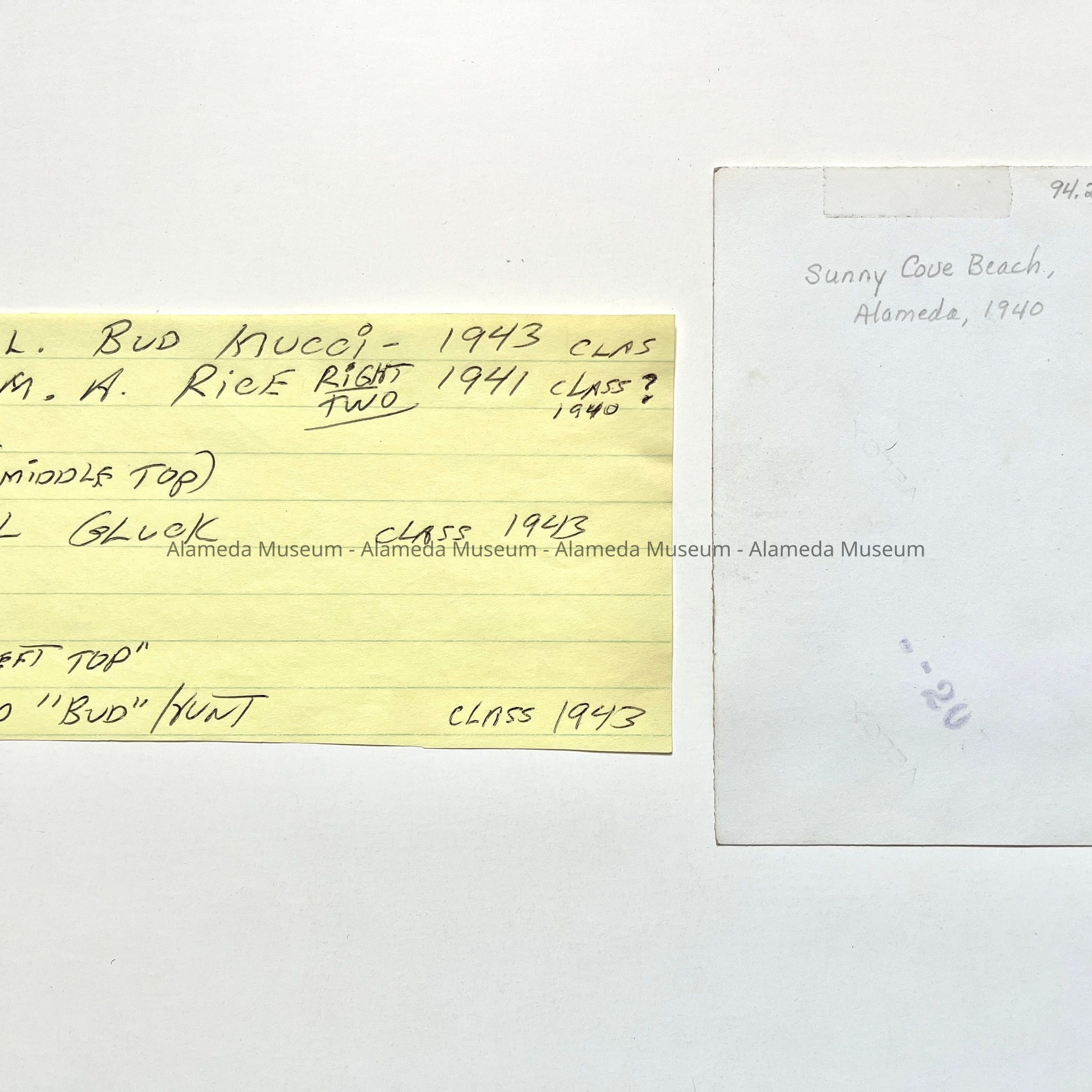 Group photo young men in bathing suits, Sunny Cove Beach, 1940Entry/Object ID