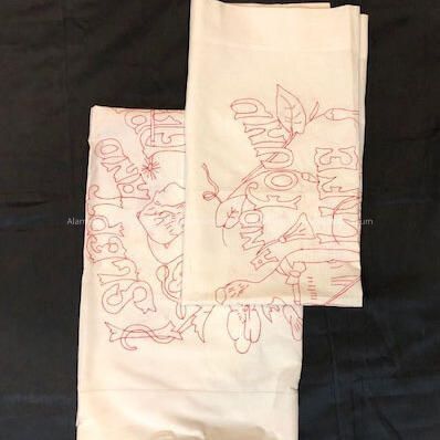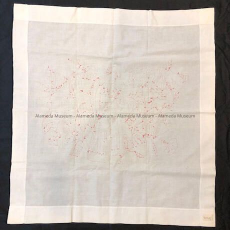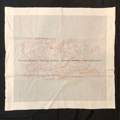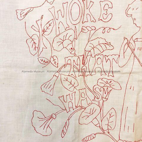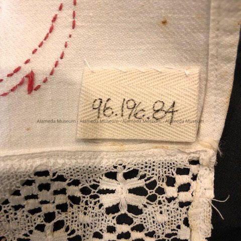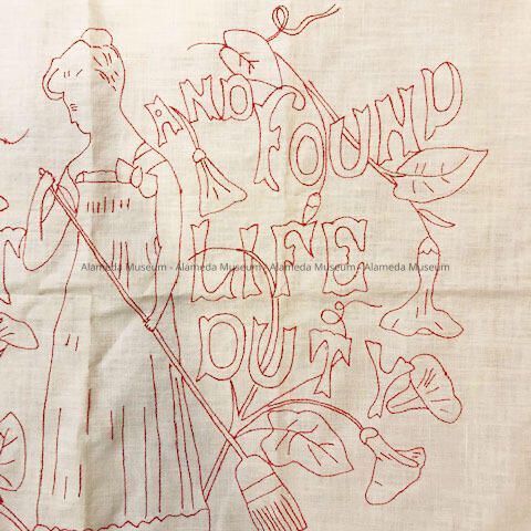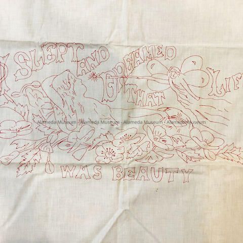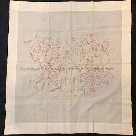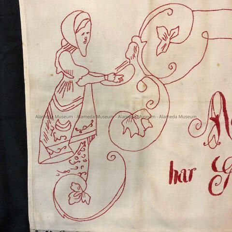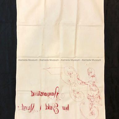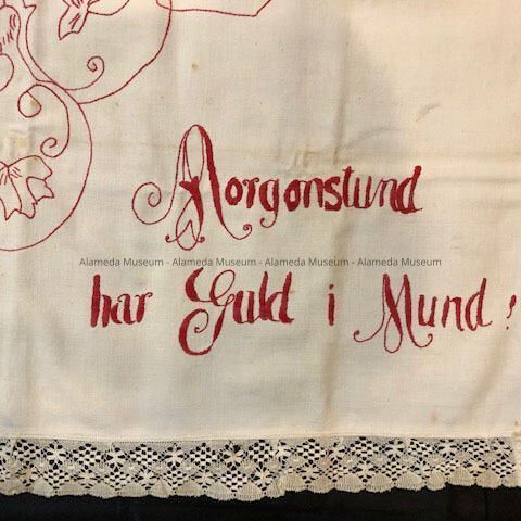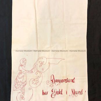 TOWEL THAT BELONGED TO THE EKBERG FAMILY, OLD-TIME RESIDENTS OF ALAMEDA. MESSAGE ON GUEST TOWEL IS IN A FOREIGN LANGUAGE: "MORGONSTUND HAR GULD I MUN." A TRANSLATION WAS MADE ON 05 NOV 97 BY A NATIVE OF SWEDEN, WHO OFFERED THE MESSAGE: "THE EARLY BIRD CATCHES THE WORM!"