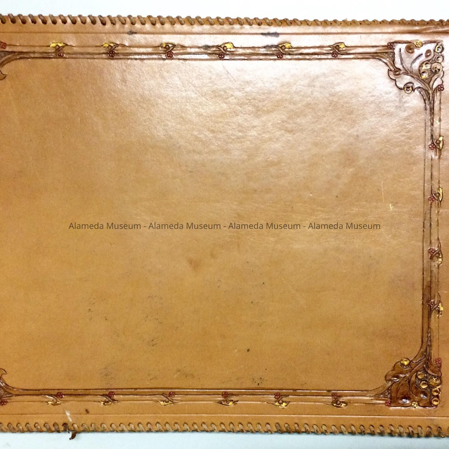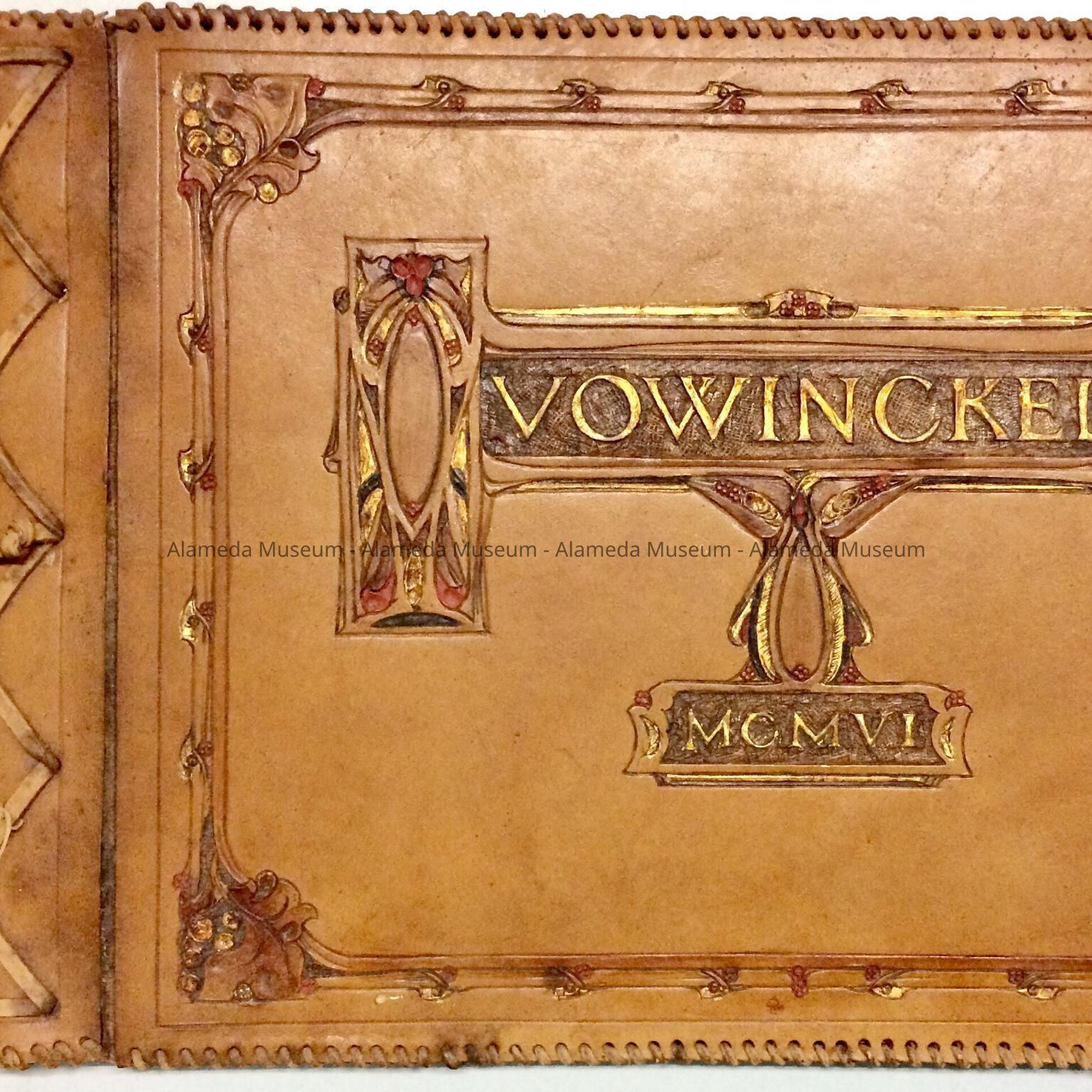 DESCRIPTION: GUEST BOOK WITH COVER OF HAND-TOOLED LEATHER AND A CENTRAL DESIGN OF RAISED LETTERS, "VOWINCKEL," AND THE DATE IN ROMAN NUMERALS (1906). THE EDGE OF THE GUEST BOOK IS WHIPSTITCHED IN LEATHER.