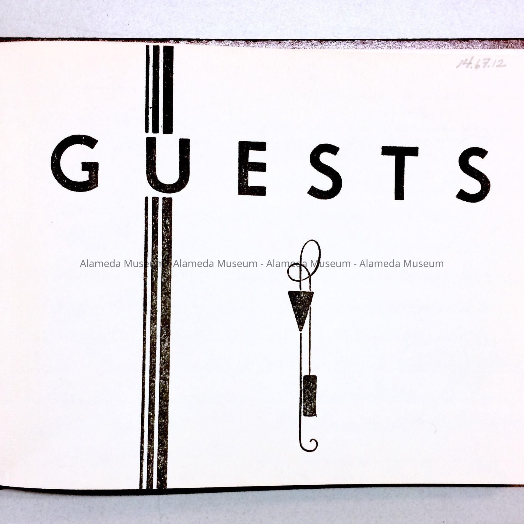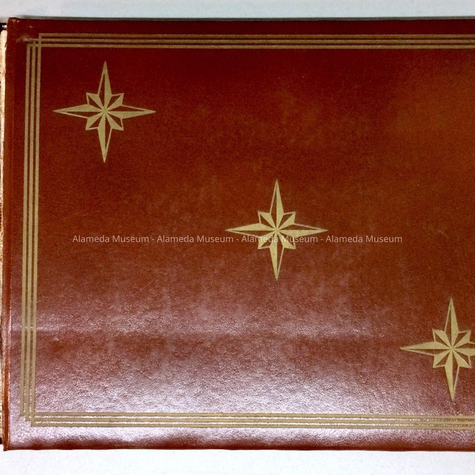 A HARD-BOUND GUEST BOOK, WITH PLASTICIZED FABRIC IN BROWN-COLORED IMITATION LEATHER ACCENTUATED WITH DESIGNS IN GOLD-COLORED TYPE.