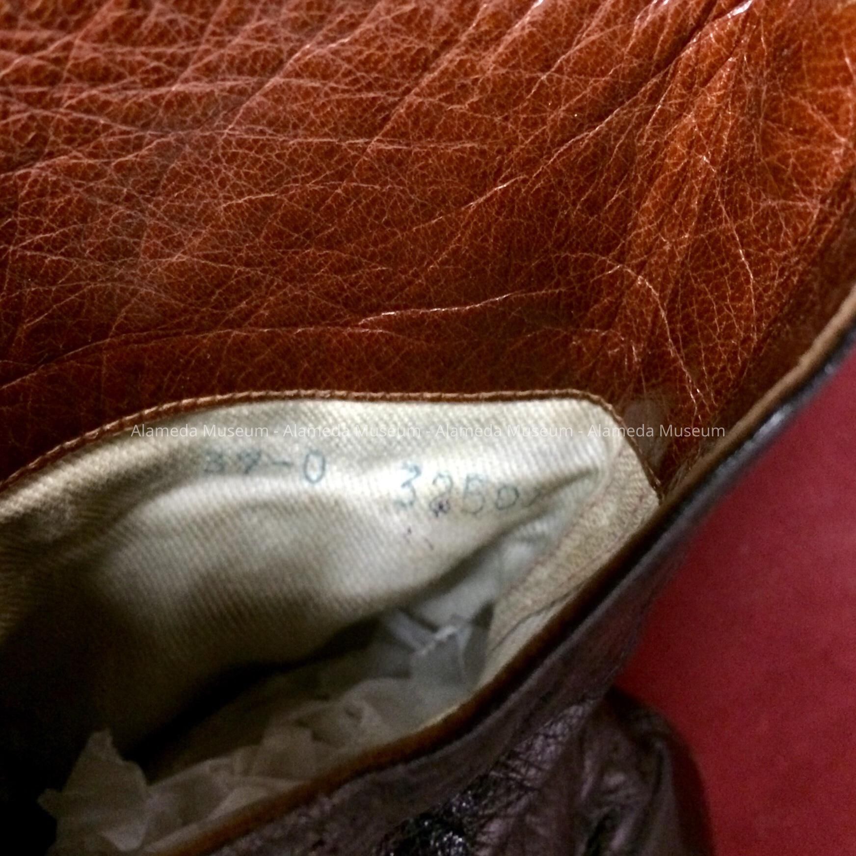 Description: Pair of gun metal colored leather shoes, high button type. Interior of both shoes printed with serial numbers 37-0 325501. French style heels.