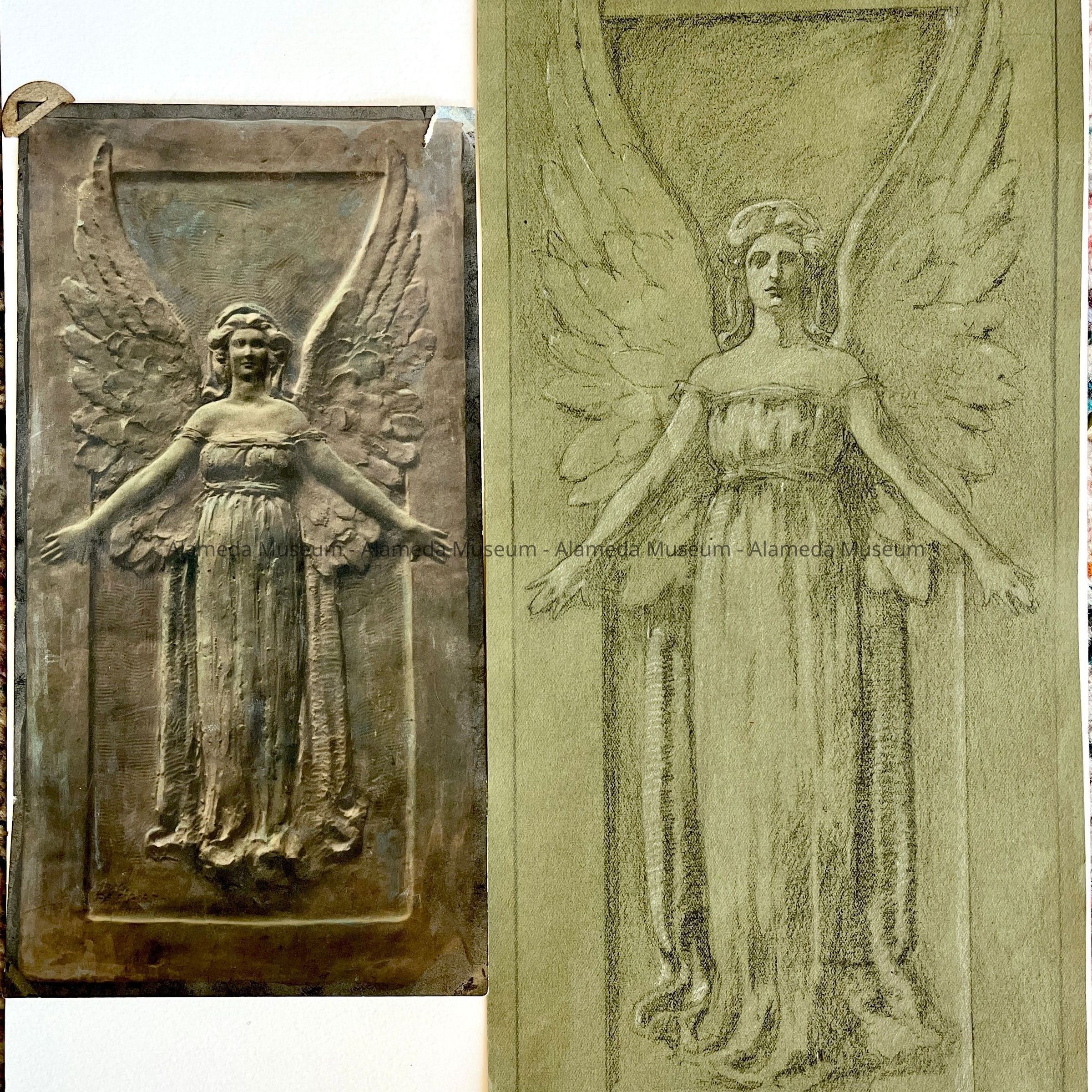 A photo (B) of a sculpted angel, and black- and white pencil sketch (A) of same figure on olive-green chalk paper. THE sketch has caption: Sketch for Mausoleum door - H. Patigian - SC.
