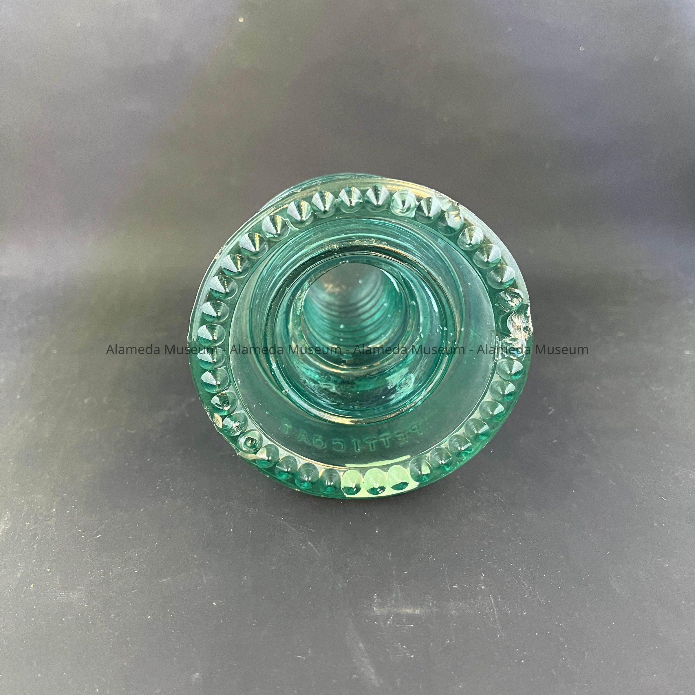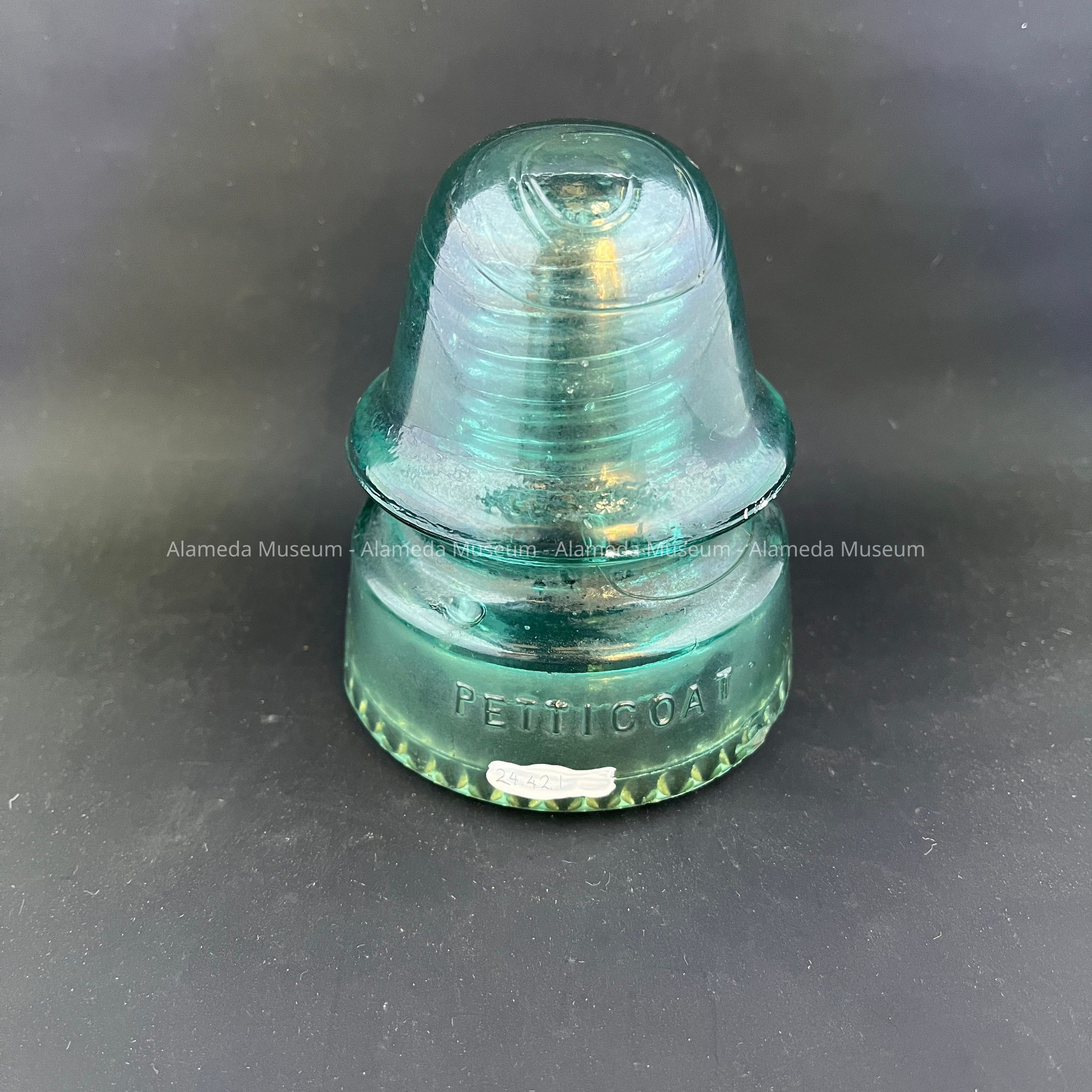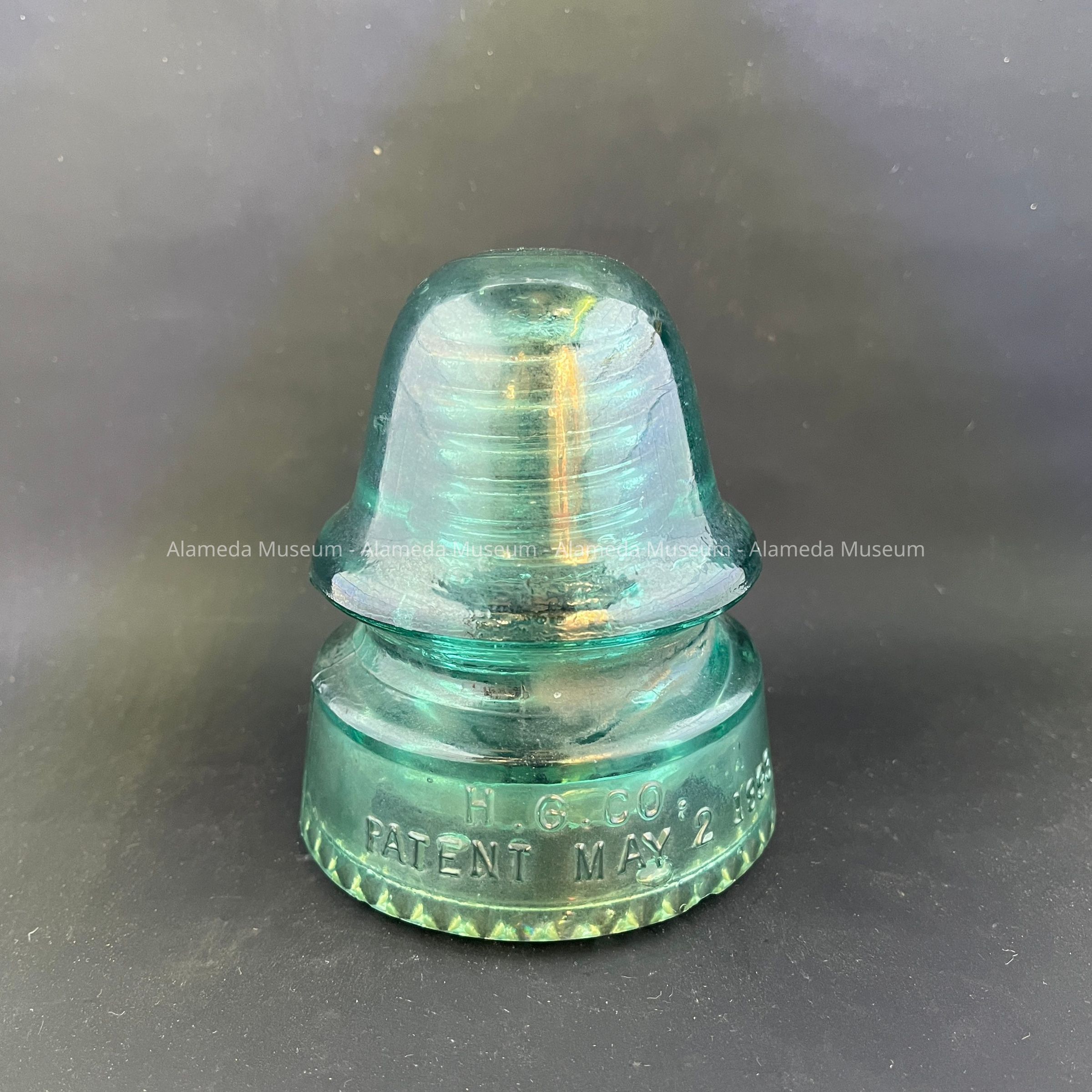 Description: a dome-shaped turquoise colored glass insulator. It is smooth on the outside but has ribs or a screw-thread on the inside, and notches along the flared bottom edge - some are broken. Embossed on one side is: 'H.G. Co. / PATENT MAY 2, 1893', and on the other side, 'PETTICOAT'.