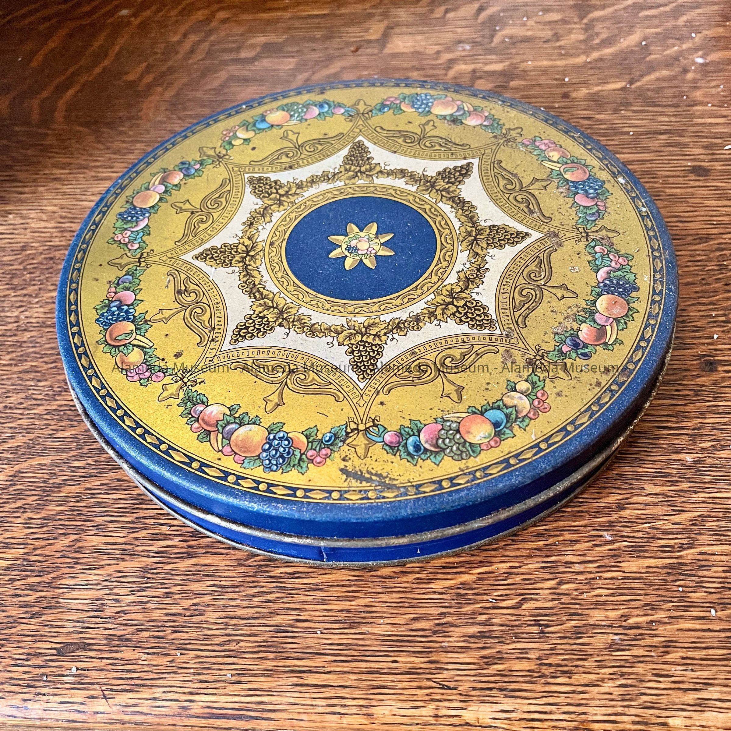 A CIRCULAR-SHAPED CANDY TIN. COVER HAS A DECORATIVE DESIGN OF LITHOGRAPHIC FRUIT AND NEO CLASSIC DESIGN ON A GOLD-COLORED BACKGROUND.