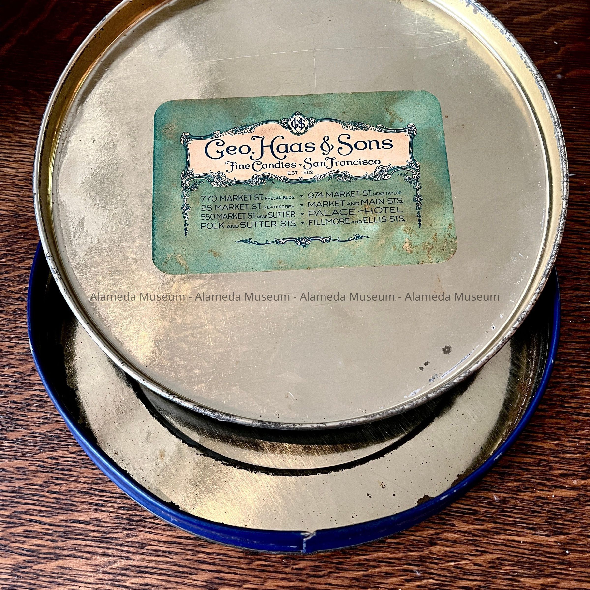 A CONTAINER THAT ONCE STORED HAAS & SONS, SAN FRANCISCO CANDIES, OWNED BY THE MEYERS' FAMILY.