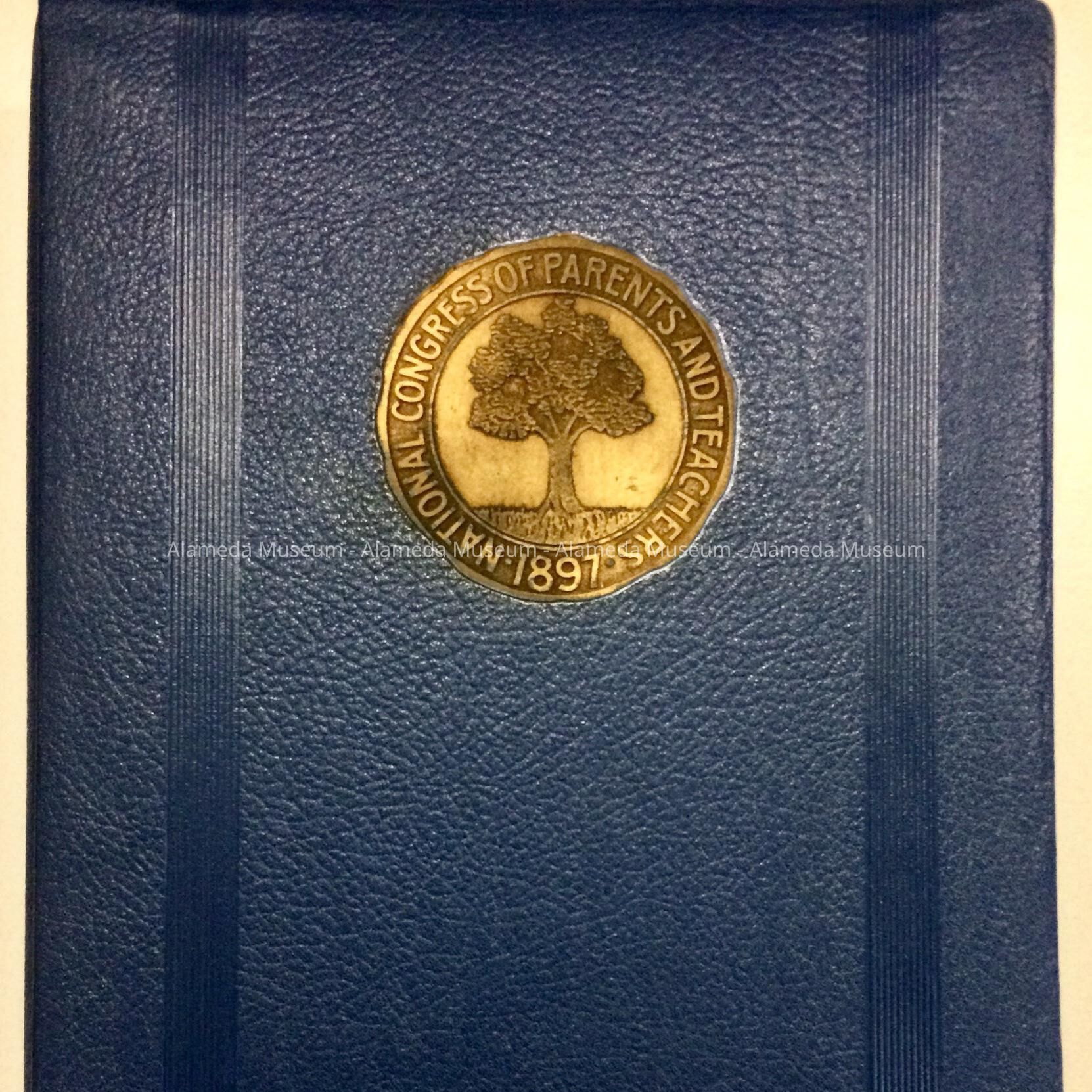 Binder bound with brads with folded-over cover of blue faux-leather, with embossed gold-colored escutcheon of a tree, encircled with the legend ‘National Congress of Parents and Teachers, 1897’. Includes Publicity Record Declaration sheet stating Haight-Franklin, board and committee list, and newspaper clippings starting from April 1947. Last entries are from early 1948.
