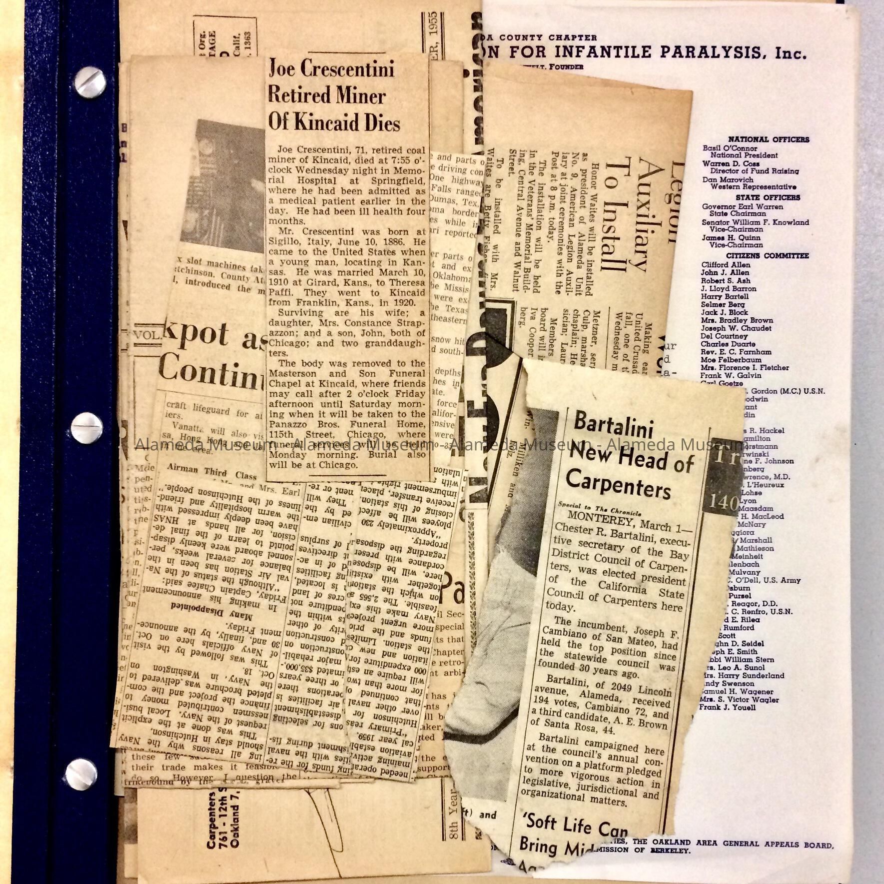 Also, includes clippings dating between 1949-1958 apparently related to Chester Bartilini, two 1958 letters to Mrs. Bartilini related to the ‘March of Dimes’ fundraising for the Alameda Chapter of the national foundation for infantile paralysis, a home-made paper purple heart with poem, and a typed 1945-1946 PTA directory in a handmade decorated grey cover.