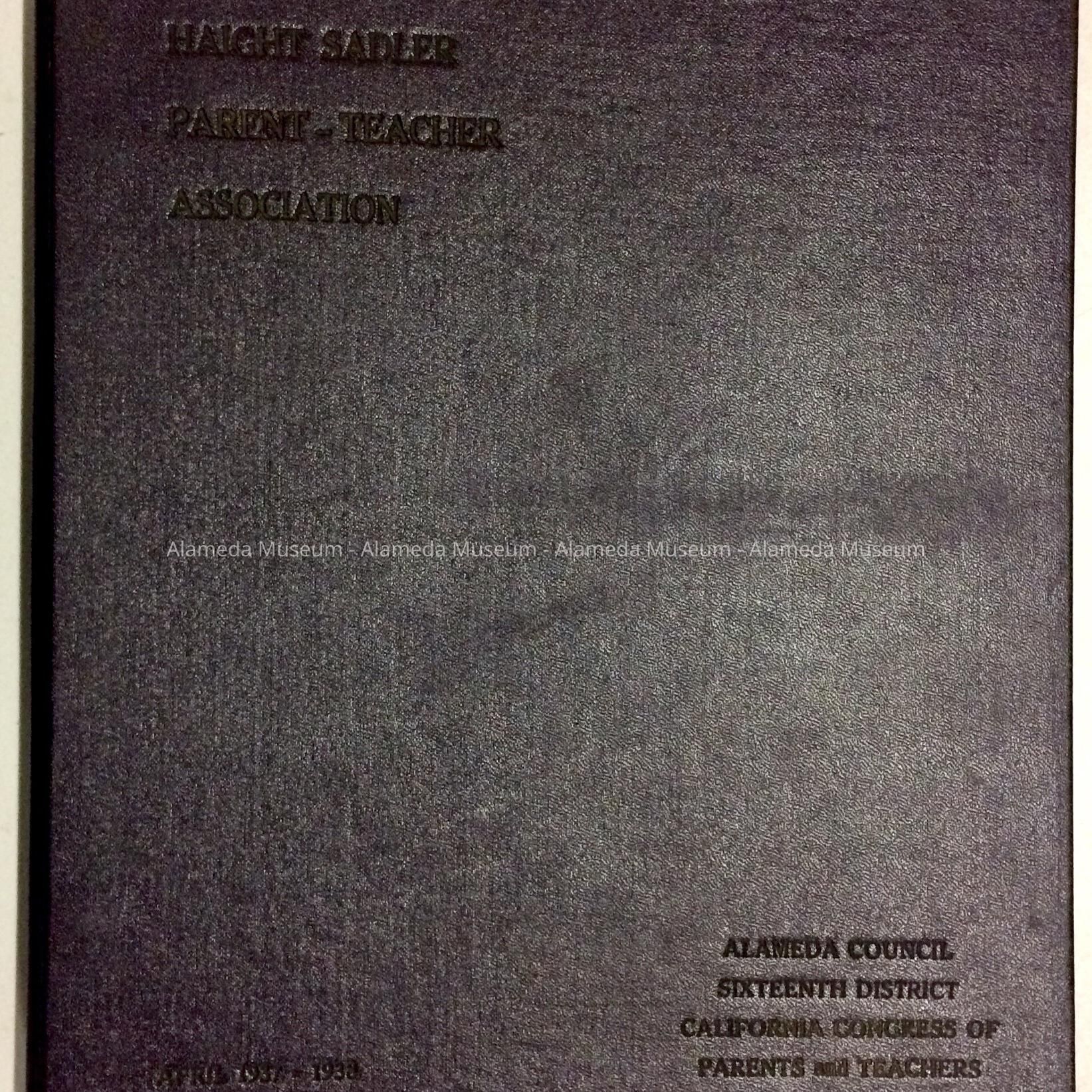 Haight Sadler Parent-Teacher Association, April 1937 - April 1938, Alameda Council, Sixteenth District, California Congress of Parents and Teachers. Front cover appears black; spine and back cover dark navy blue.