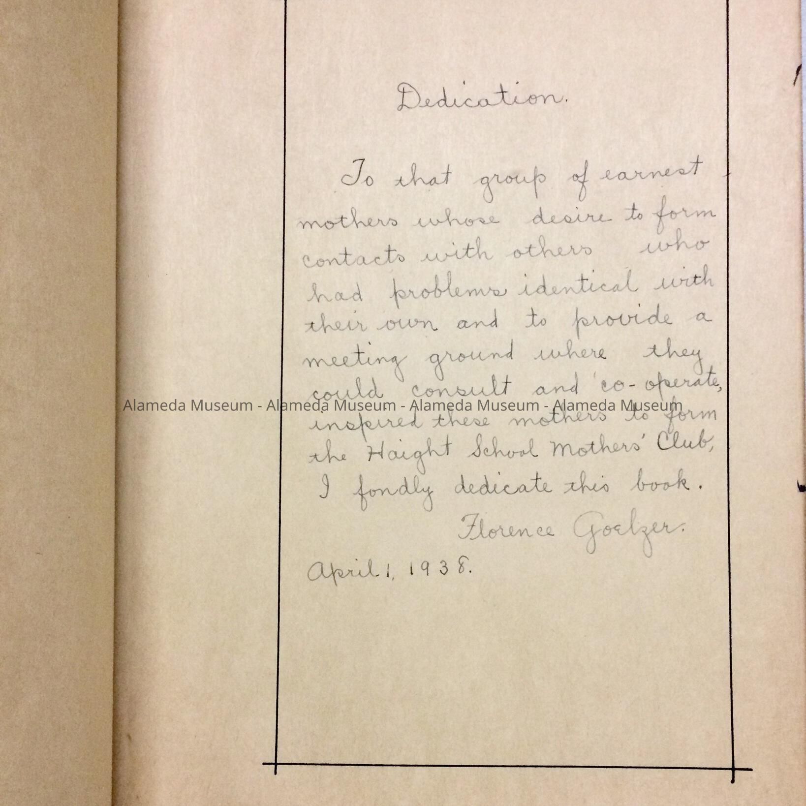 History of Object: Publicity Record of the Haight-Sadler School P.T.A. for 1937-1938. Includes a record declaration form, a postcard of Haight School, a dedication page signed by Florence Goelzer, and glued newspaper clippings organized according to a topical index. Also includes a sample Christmas card sent to teachers, and a program for the March 3, 1945 Teachers Lunch provided by the PTA.