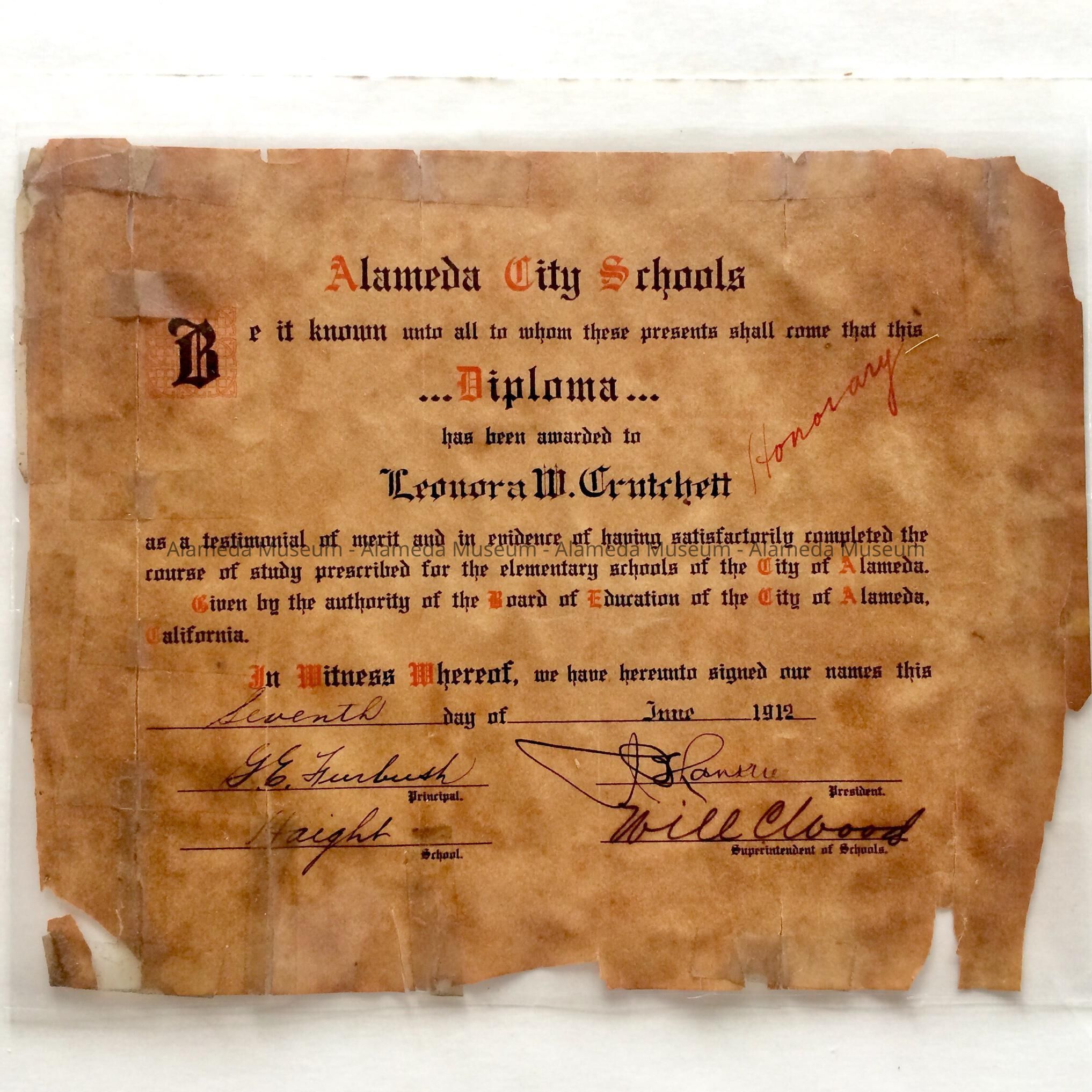 History of Object: Diploma (8th grade) awarded Leonora W. Crutchett, Haight School, Alameda, & dated June-1912.