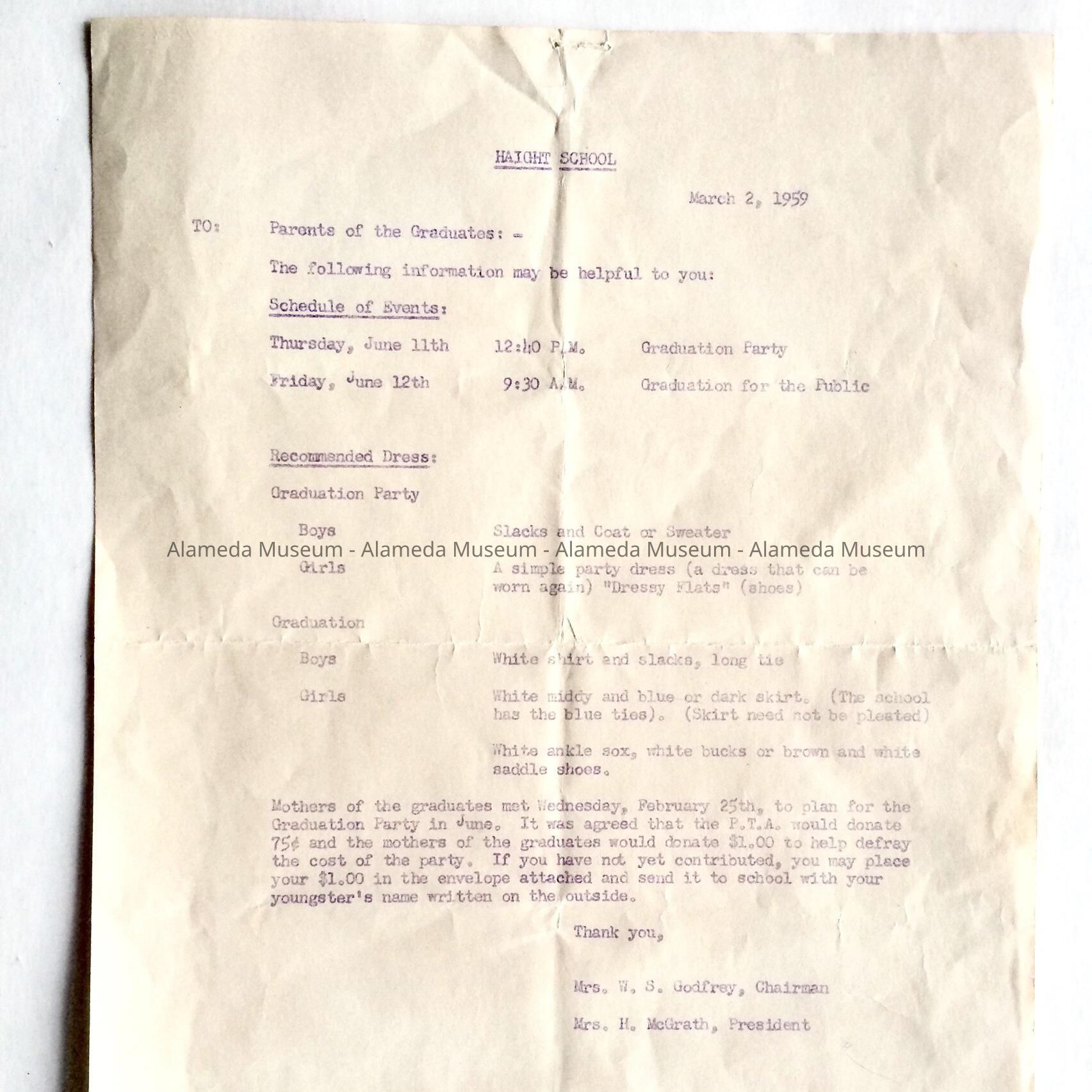 HISTORY OF OBJECT: AN INFORMATION SHEET FROM 1959 CONCERNING THE APPROPRIATE CLOTHING REQUIRED AT THE EIGHTH GRADE GRADUATION OF HAIGHT SCHOOL.