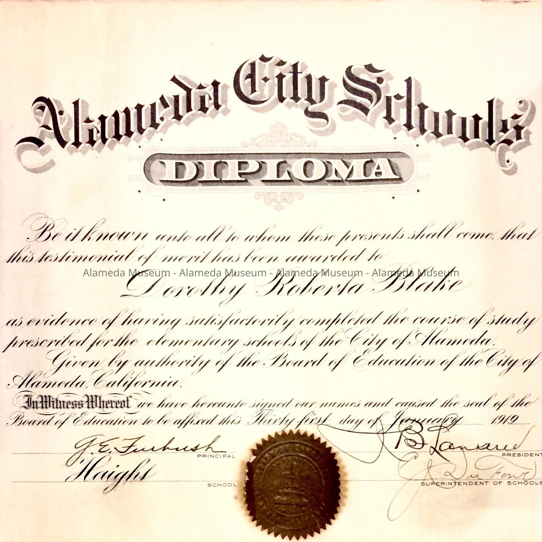 DIPLOMA AWARDED DOROTHY ROBERTA BLAKE FROM GRADUATION AT HAIGHT SCHOOL, 1919.