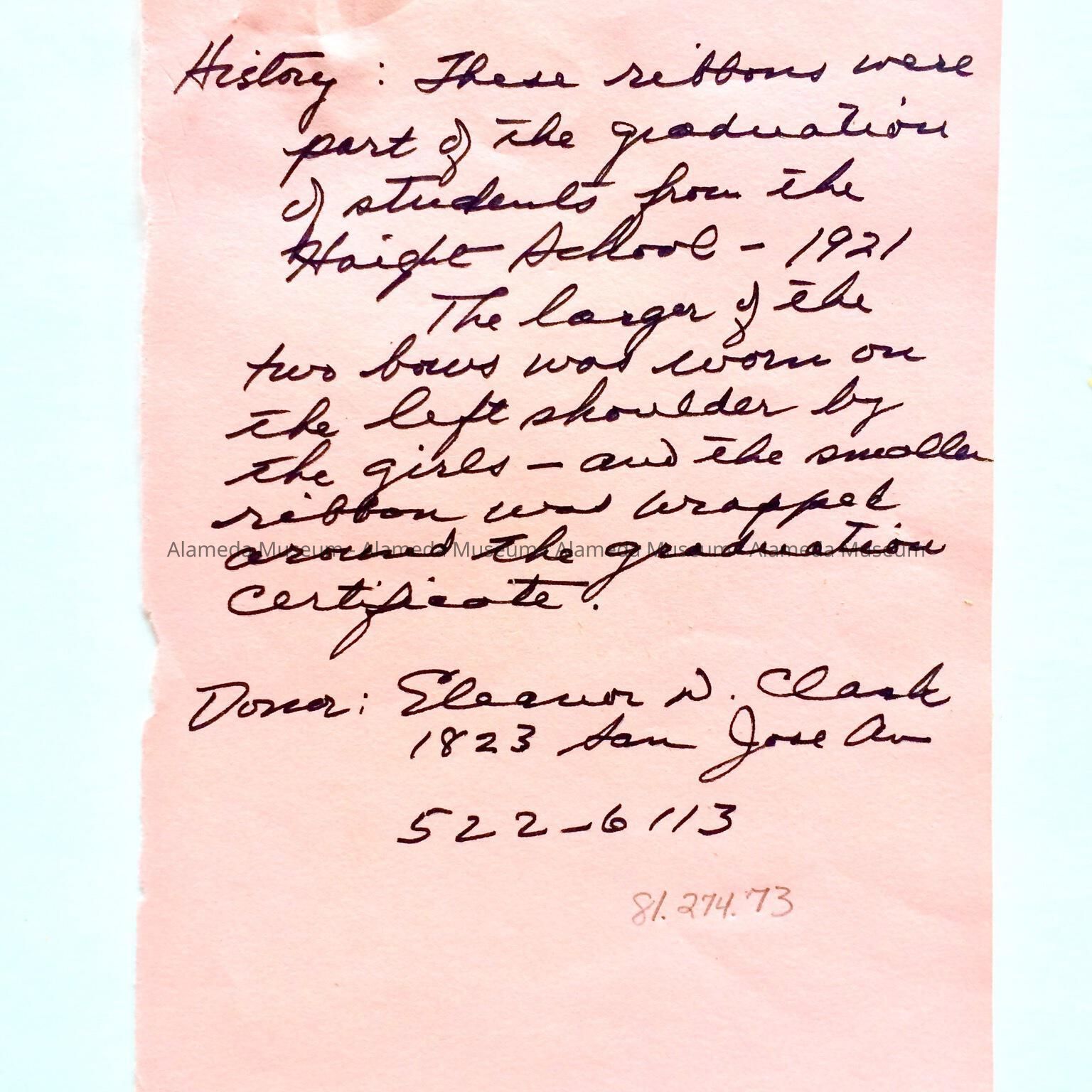History of Object: The larger of the two bows was worn on the left shoulder by the girls and the smaller ribbon was wrapped around the graduation certificate. These were used in the 1921 graduation ceremony of Haight School.
